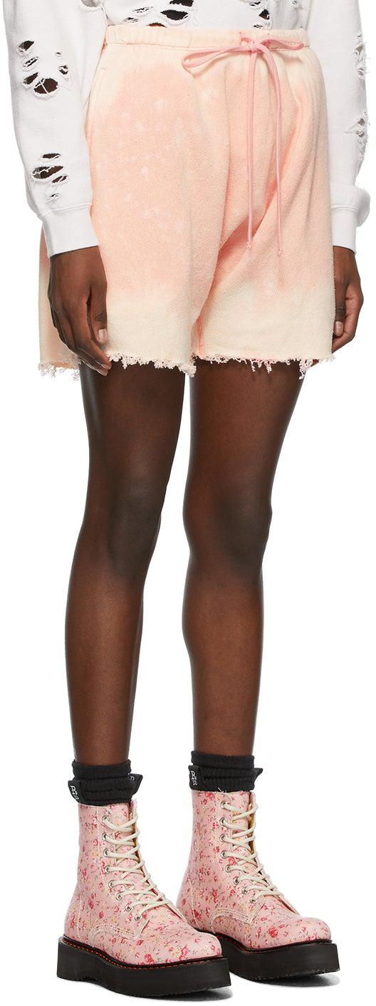 Japanese cotton terrycloth shorts in pink featuring dyed pattern. Mid-rise. Dropped inseam. Three-pocket styling. Drawstring at waistband. Raw edge at cuffs. Supplier color: Bleached pink 100% cotton. Brand: 13