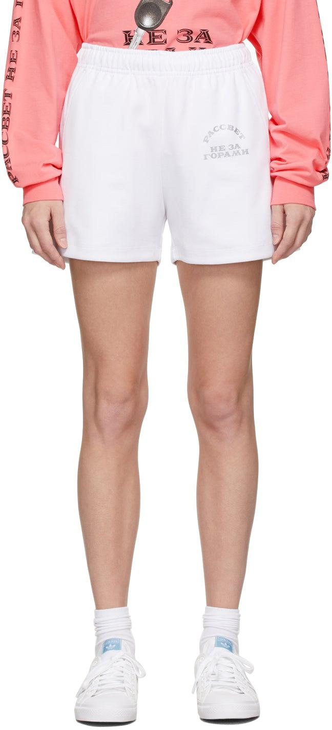 Cotton-blend jersey shorts in white. Mid-rise. Three-pocket styling. Concealed drawstring at elasticized waistband. Logo printed in grey at front. Supplier color: White 50% cotton, 50% polyester. Brand: Rassvet