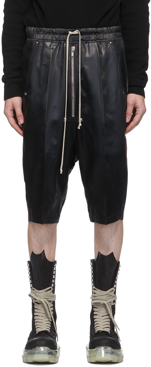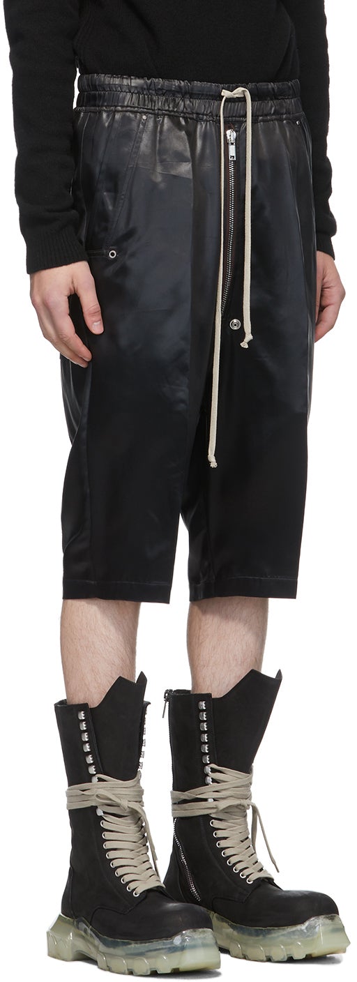 Nylon-blend satin shorts in black. Mid-rise. Dropped inseam. Four-pocket styling. Drawstring at elasticized waistband. Press-stud and eyelet detailing at front. Zip-fly. Silver-tone hardware. Supplier color: Black 61% acetate, 39% nylon. Brand: Rick Owens