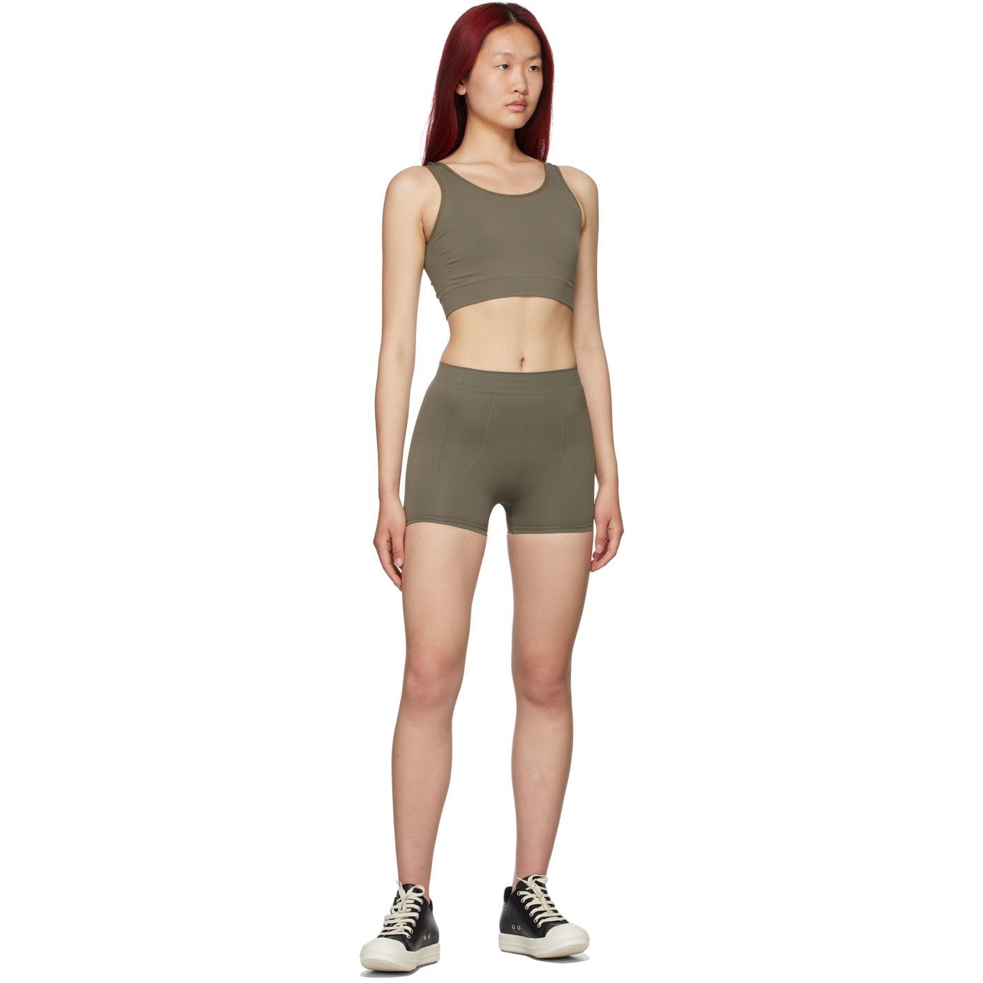Paneled stretch piqué shorts in grey. Mid-rise. Pinched seams throughout. Rib knit waistband and cuffs. Textured knit trim at outseams. Supplier color: Dust 95% polyester, 5% elastane. Brand: Rick Owens