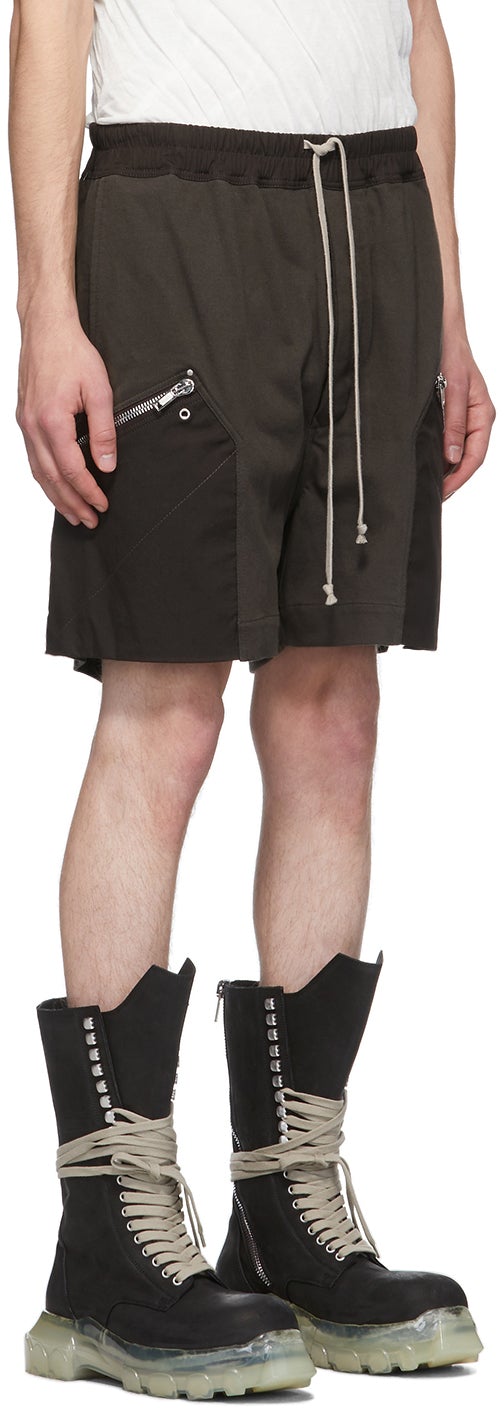 Cotton jersey shorts in grey. Mid-rise. Tonal cotton canvas trim throughout. Two-pocket styling. Drawstring at elasticized waistband. Zippered pockets at front. Button-fly. Silver-tone hardware. Supplier color: Dark dust Body: 100% cotton. Trim: 97% cotton, 3% elastane. Brand: Rick Owens