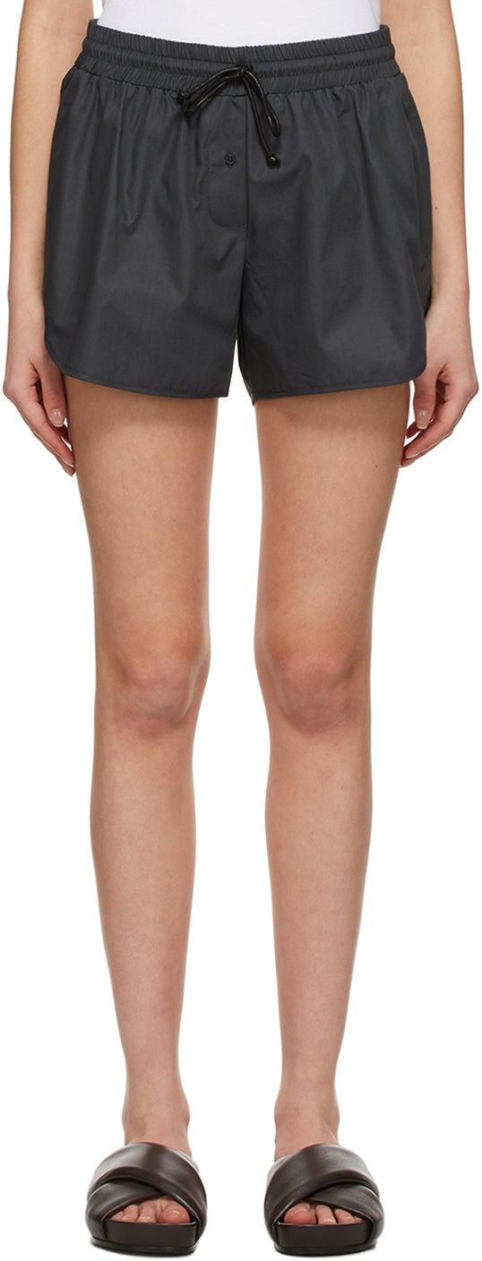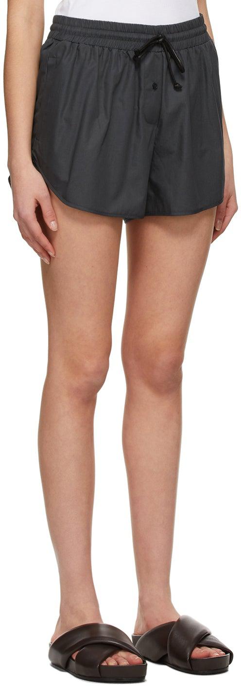 Cotton poplin shorts in grey. Mid-rise. Three-pocket styling. Drawstring at elasticized waistband. Vented side-seams. Mock-fly with button accent. Black hardware. Supplier color: Rock 100% cotton. Brand: Rika Studios