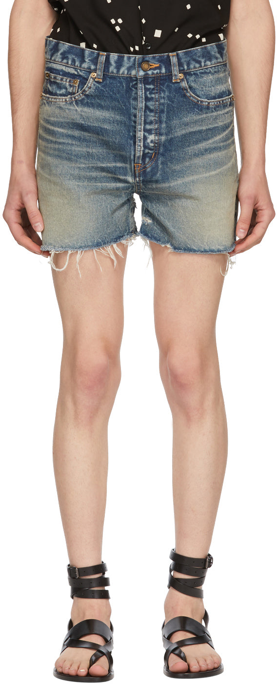 Non-stretch denim shorts in blue. Mid-rise. Fading, whiskering, and distressing throughout. Five-pocket styling. Belt loops at waistband. Raw edge at cuffs. Zip-fly. Bronze-tone hardware. Supplier color: Rusty dark blue 100% cotton. Brand: Saint Laurent