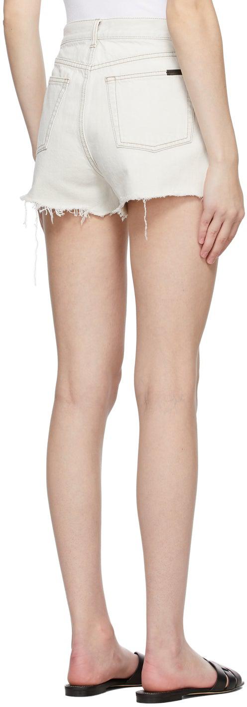 Non-stretch denim shorts in off-white. Mid-rise. Five-pocket styling. Belt loops at waistband. Raw edge at cuffs. Antiqued gold-tone hardware. Contrast stitching in brown. Button-fly. Supplier color: Grey/Off-White 100% cotton. Brand: Saint Laurent