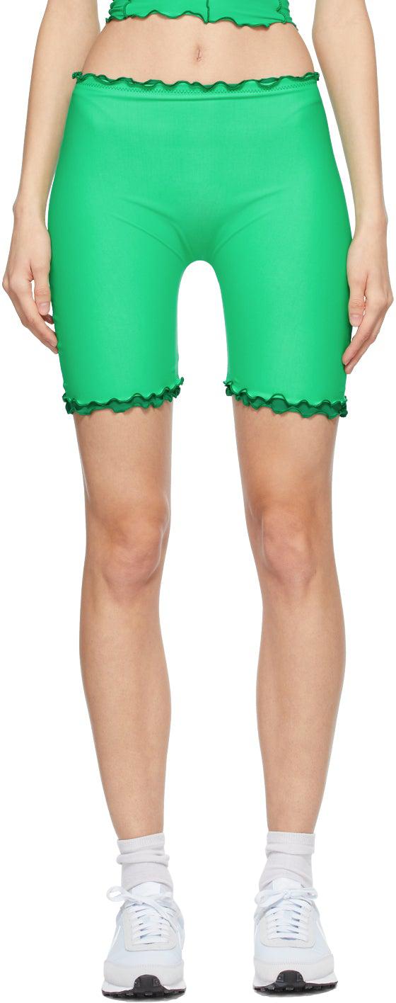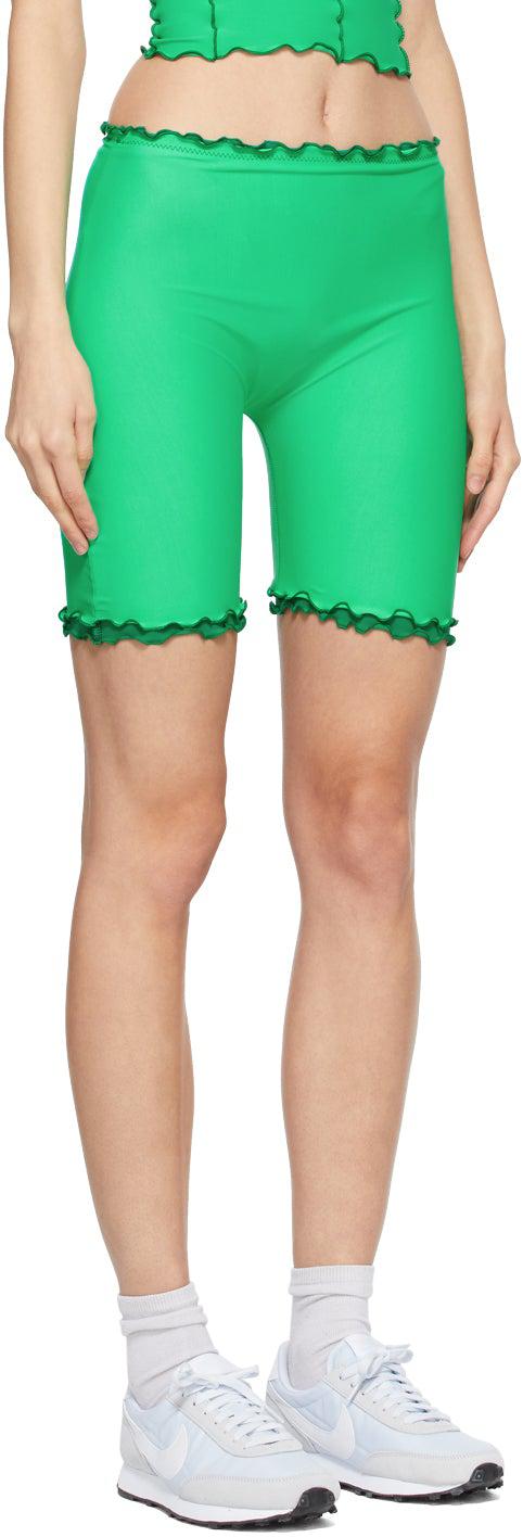 Stretch nylon jersey shorts in green. Mid-rise. Lettuce edges throughout. Tonal nylon jersey lining. Supplier color: Green 80% nylon, 20% spandex. Brand: Sherris