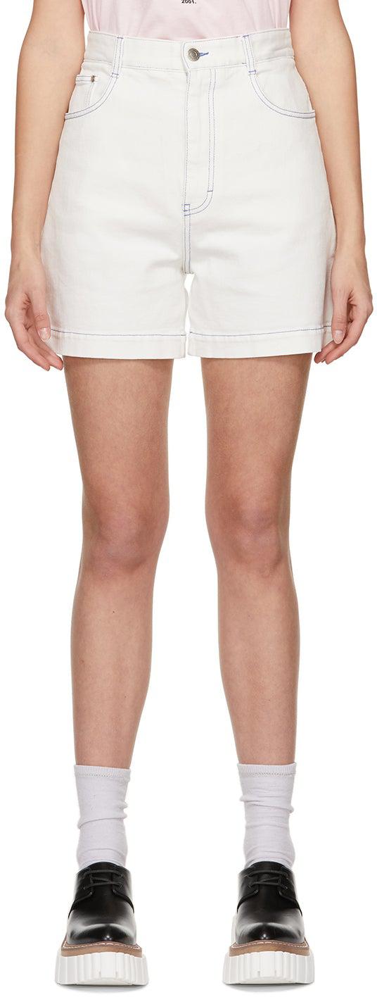 Stretch cotton-blend denim shorts in white. High-rise. Five-pocket styling. Belt loops at waistband. Embossed faux-leather logo patch in tan at back waistband. Logo embroidered in blue at back pocket. Zip-fly. Logo-engraved silver-tone hardware. Contrast stitching in blue. Made from cruelty-free, non-animal materials. Part of the Unisex Stella McCartney Shared capsule collection. Supplier color: White wash denim Body: 95% cotton, 4% polyester, 1% elastane. Trim 1: 55% polyester, 45% cotton. Trim 2: 100% polyester. Brand: Stella McCartney