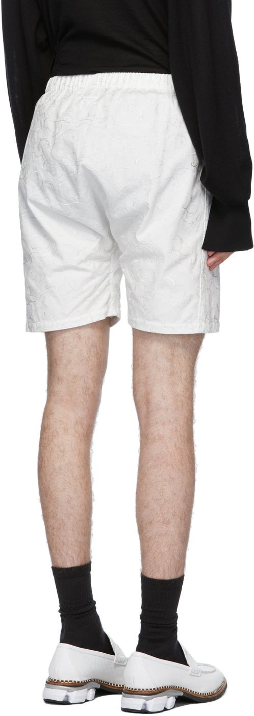 Cotton canvas shorts in white featuring tonal embroidered pattern throughout. Mid-rise. Elasticized waistband. Button-fly. Supplier color: White Body 1: 100% cotton. Body 2: 100% rayon. Brand: Sulvam