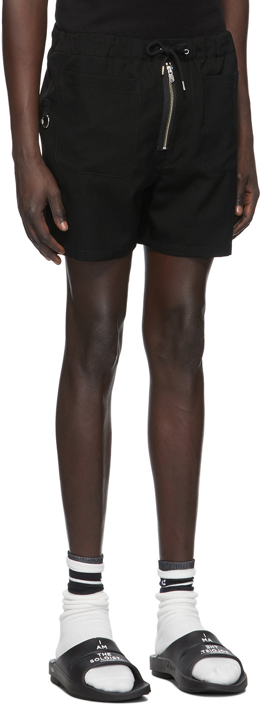 Wool twill shorts in black. Mid-rise. Two-pocket styling. Drawstring at elasticized waistband. Webbing trim and D-ring hardware at outseams. Topstitching in white at back. Zip-fly. Silver-tone and gold-tone hardware. Supplier color: Black 100% wool. Brand: TAKAHIROMIYASHITA TheSoloist.