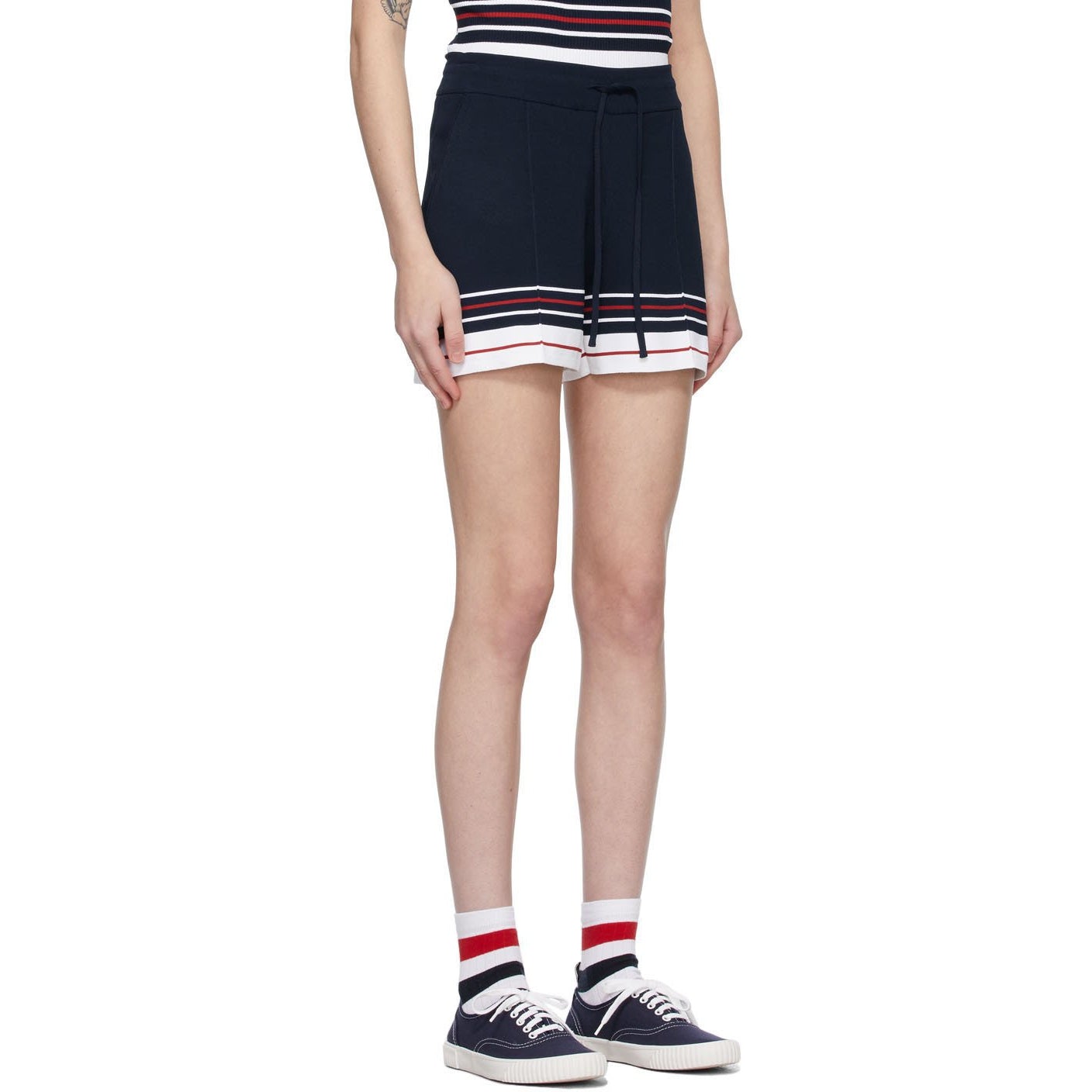 Rib knit viscose-blend shorts in navy. Mid-rise. Two-pocket styling. Drawstring at waistband. Signature tricolor grosgrain flag at back waistband. White and red stripes at cuffs. Vented outseams. Supplier color: Navy 75% viscose, 25% polyester. Brand: Thom Browne
