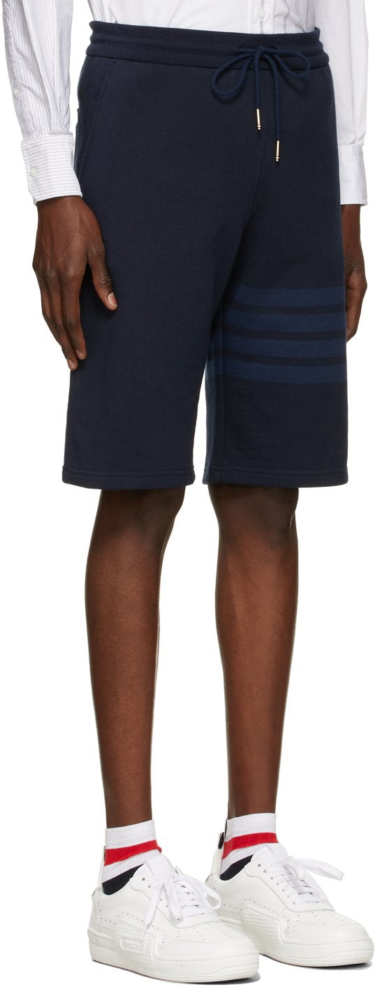 French terry shorts in navy. Mid-rise. Three-pocket styling. Drawstring at waistband. Signature stripes in blue at leg. Signature tricolor grosgrain flag at back waistband. Silver-tone hardware. Supplier color: Navy 100% cotton. Brand: Thom Browne