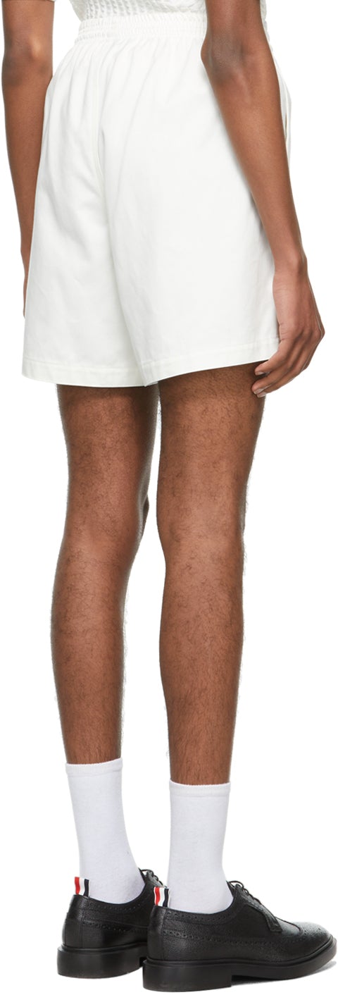 Cotton twill shorts in off-white. Mid-rise. Two-pocket styling. Drawstring in white at elasticized waistband. Textile logo patch in white at front hem. Signature tricolor grosgrain flag at back waistband. Silver-tone hardware. Supplier color: White 100% cotton. Brand: Thom Browne