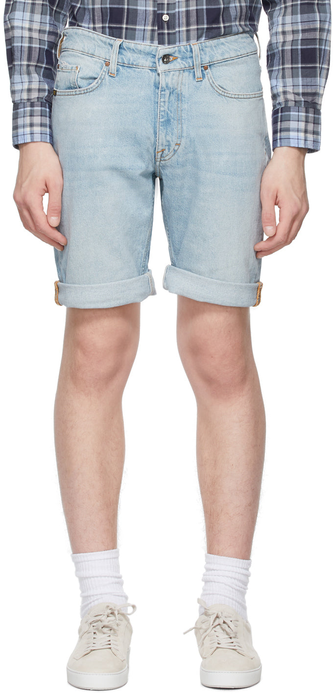 Stretch denim shorts in blue. Mid-rise. Fading and distressing throughout. Five-pocket styling. Belt loops at waistband. Logo patch at back waistband. Rolled cuffs. Zip-fly. Gunmetal-tone and copper-tone hardware. Contrast stitching in tan. Supplier color: Craze 99% cotton, 1% elastane. Brand: Tiger of Sweden Jeans
