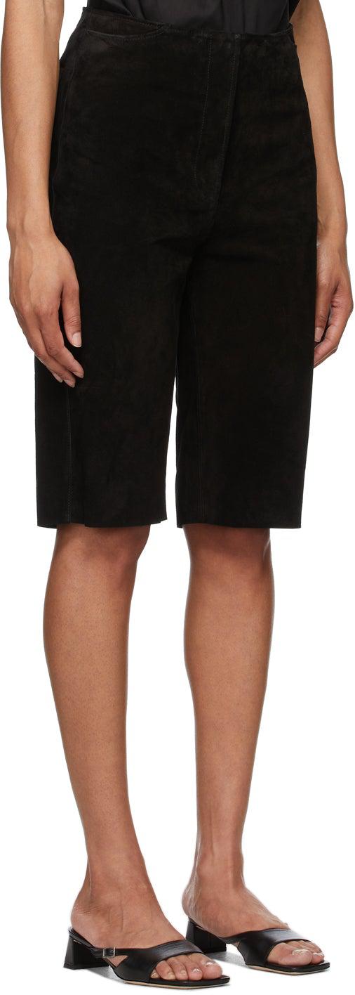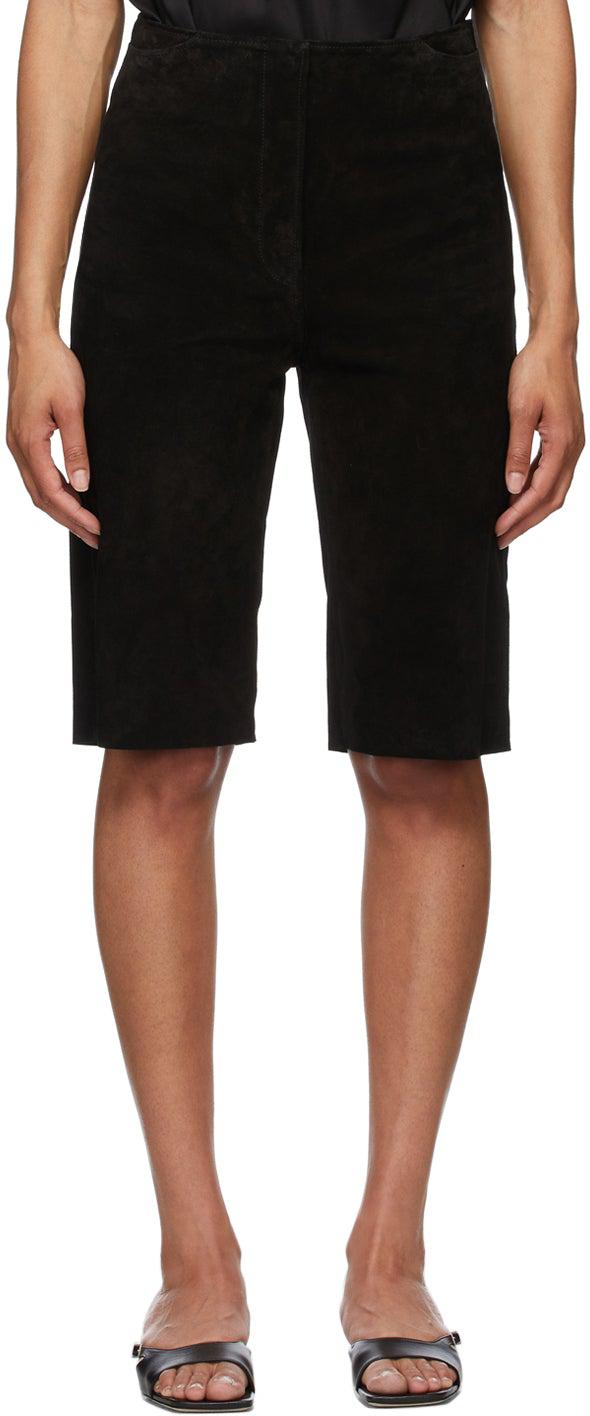Calfskin suede shorts in black. High-rise. Four-pocket styling. Raw edge at cuffs. Darts at back waistband. Full tonal viscose satin lining. Zip-fly. Silver-tone hardware. Supplier color: Black Body: 100% calfskin. Lining: 100% viscose. Brand: Totême