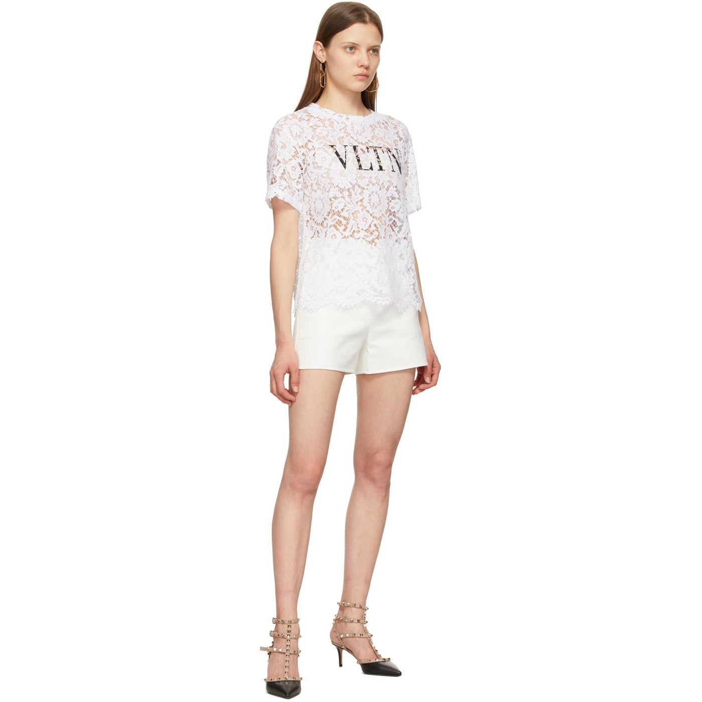Cotton twill shorts in white. High-rise. Two-pocket styling. Logo hardware at front waistband. Concealed zip closure at outseam. Gold-tone hardware. Supplier color: White 99% cotton, 1% polyamide. Brand: Valentino