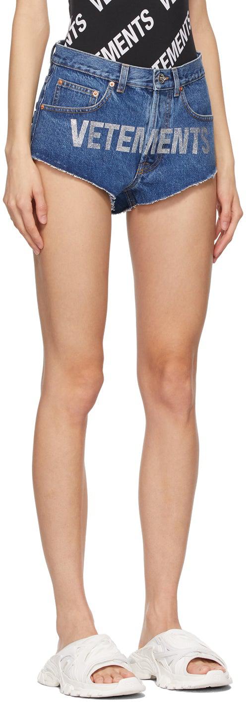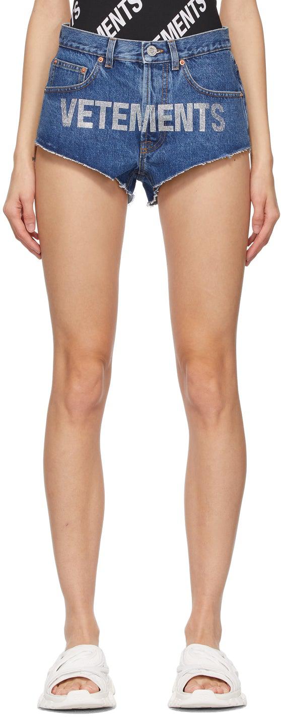 VETEMENTS Blue Denim Crystal Logo Hot Shorts