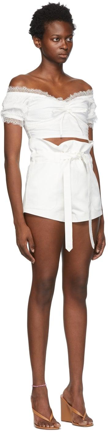 Cotton and linen-blend canvas shorts in white. High-rise. Two-pocket styling. Detachable self-tie belt at waistband. Supplier color: Off-white 62% cotton, 38% linen. Brand: Wandering