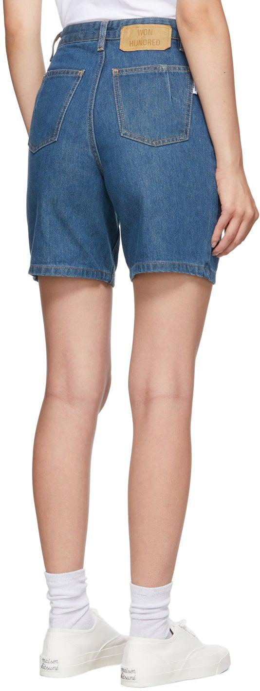 Non-stretch organic cotton denim shorts in indigo. High-rise. Five-pocket styling. Belt loops at waistband. Faux-leather logo patch in tan at back waistband. Textile logo flag in white at back pocket. Zip-fly. Logo-engraved silver-tone hardware. Contrast stitching in tan. Supplier color: Bleach 100% organic cotton. Brand: Won Hundred