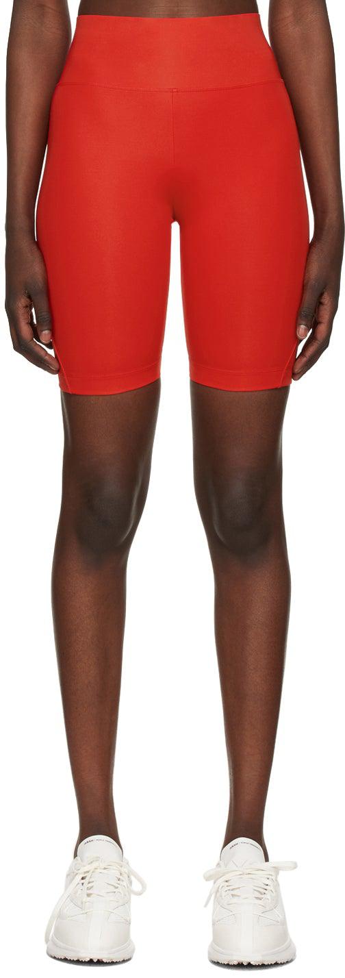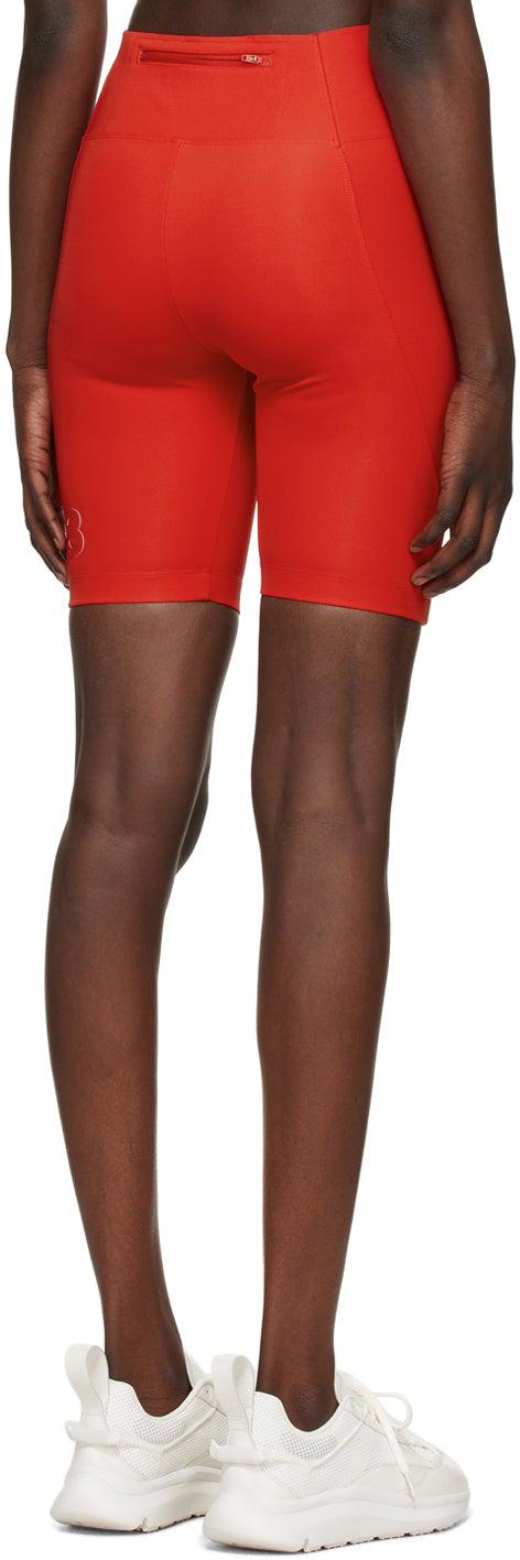 Stretch nylon jersey shorts in red. Mid-rise. Elasticized waistband. Zippered pocket at back waistband. Tonal bonded logo at back leg. Tonal hardware. Supplier color: Scarlet 75% nylon, 25% elastane. Brand: Y-3