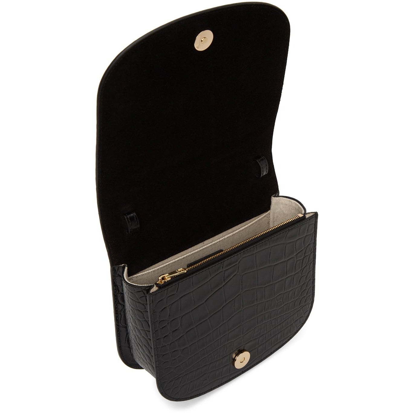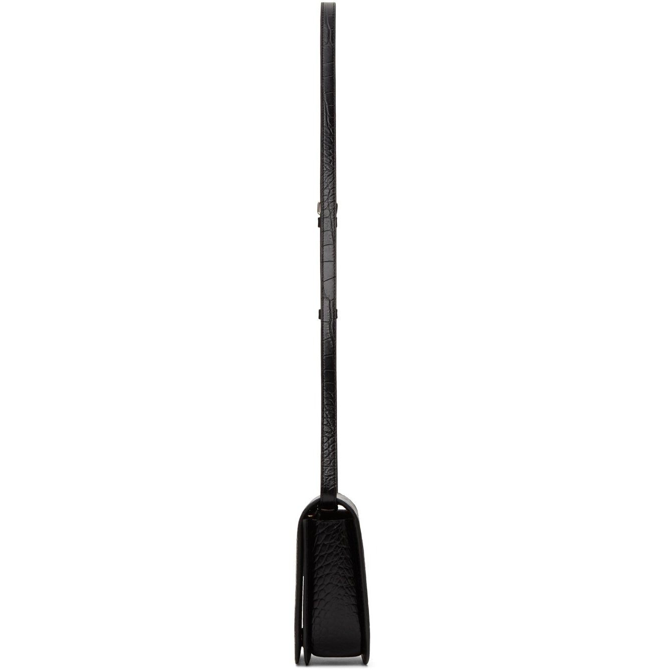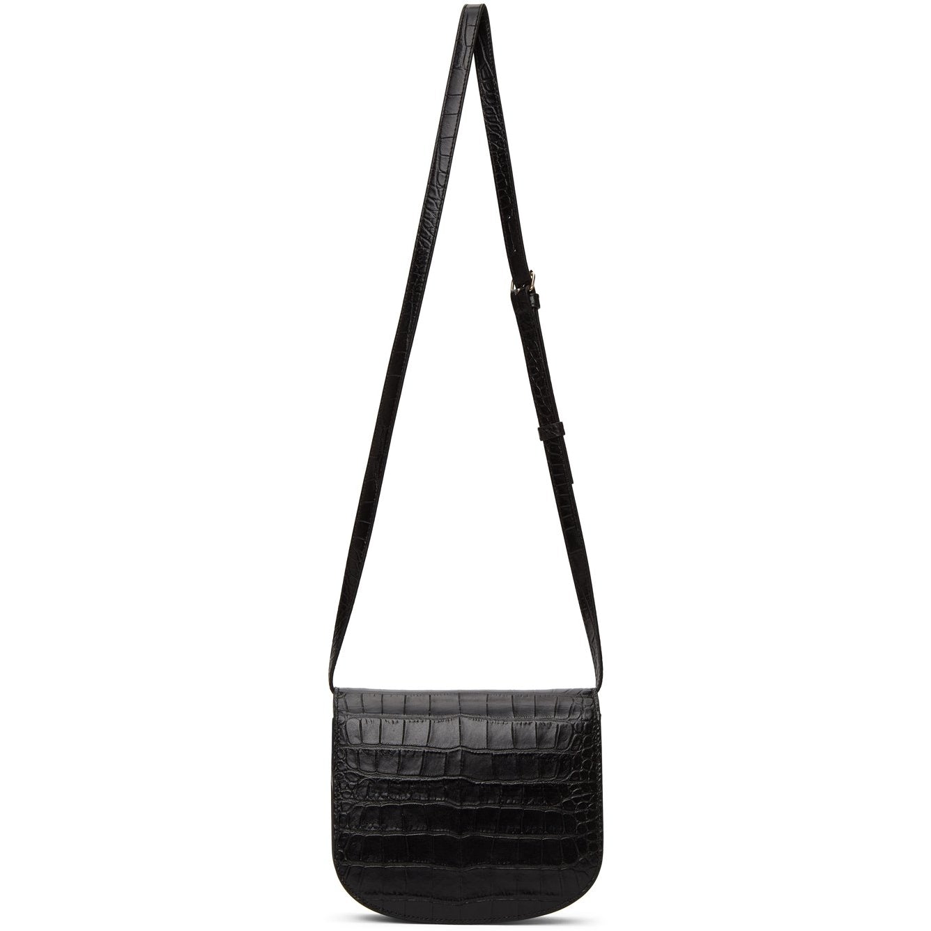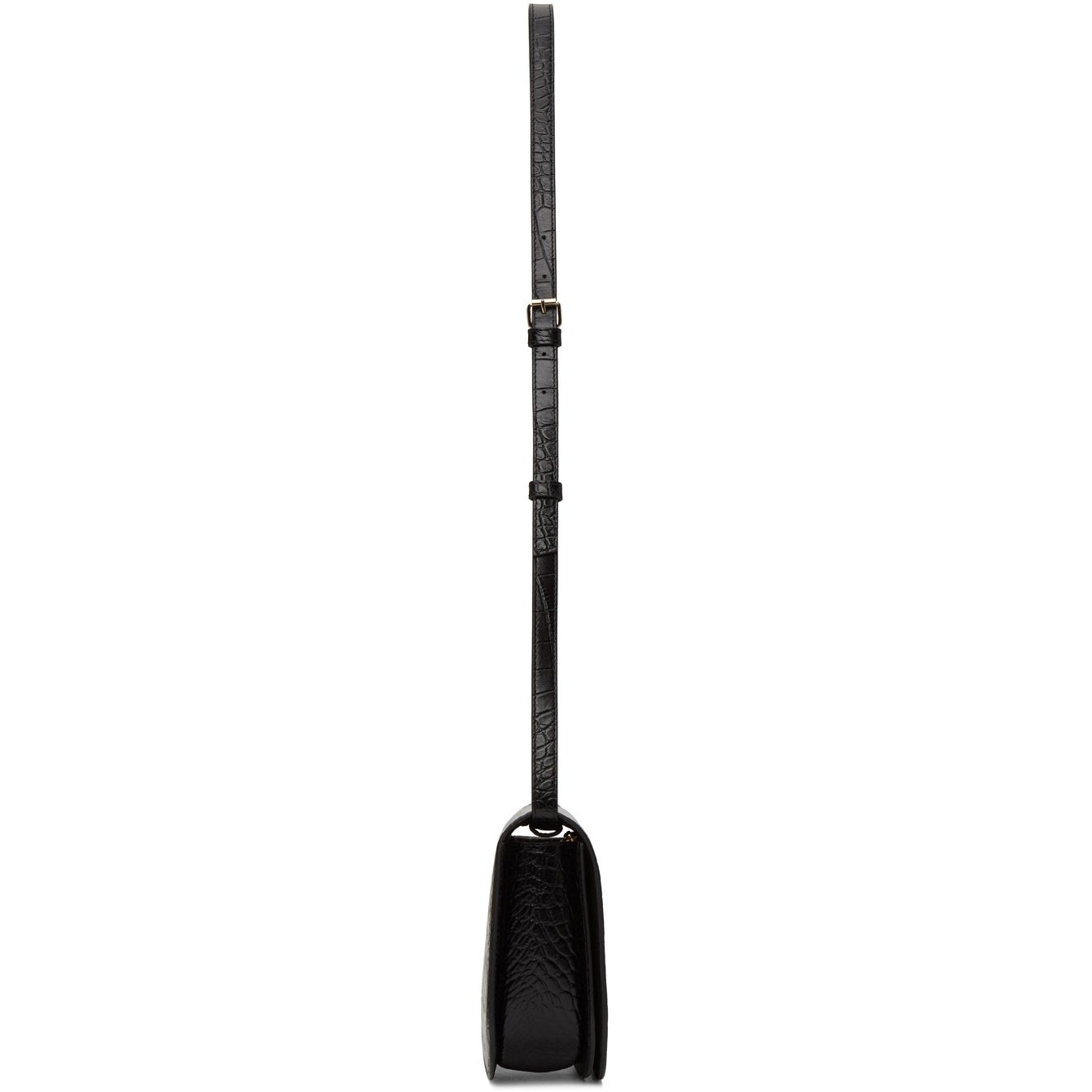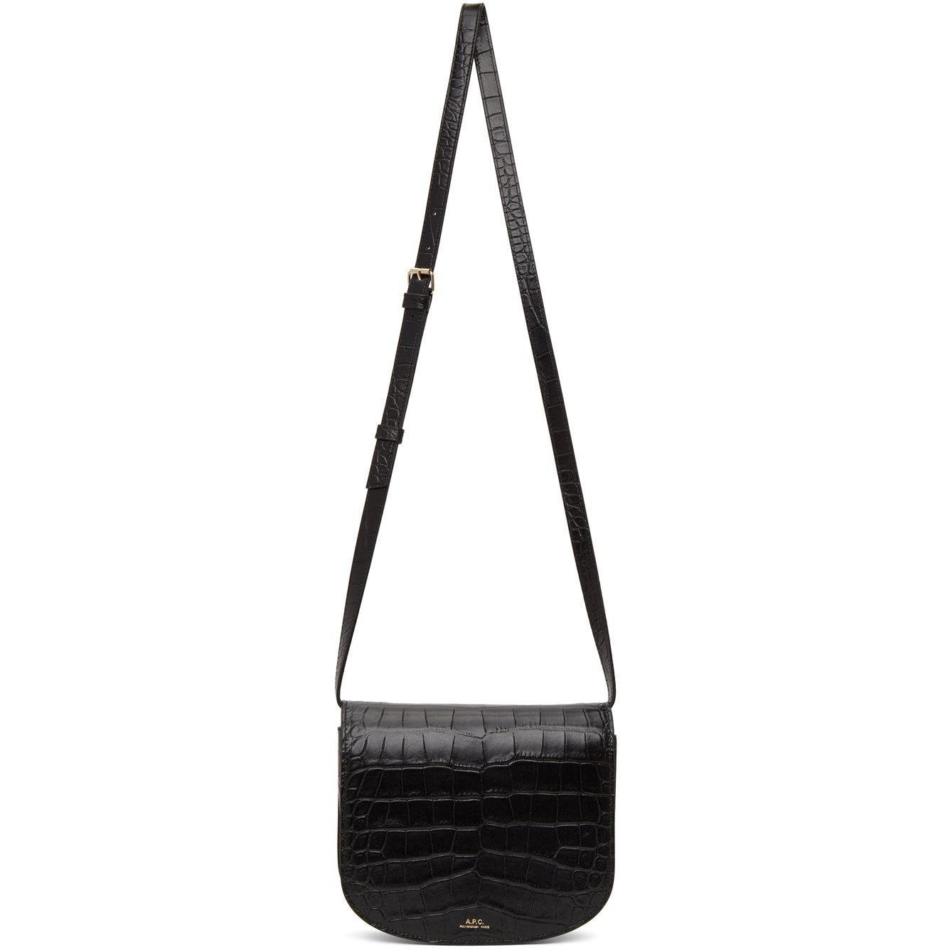 Croc-embossed calfskin shoulder bag in black. Adjustable and detachable shoulder strap with pin-buckle fastening. Logo embossed in gold-tone at face. Foldover flap with magnetic press-stud fastening. Zippered pocket at interior. Canvas lining in beige. Gold-tone hardware. Approx. 7.5 length x 6.5 height x 2.25 width. Supplier color: Black Calfskin. Brand: A.P.C.