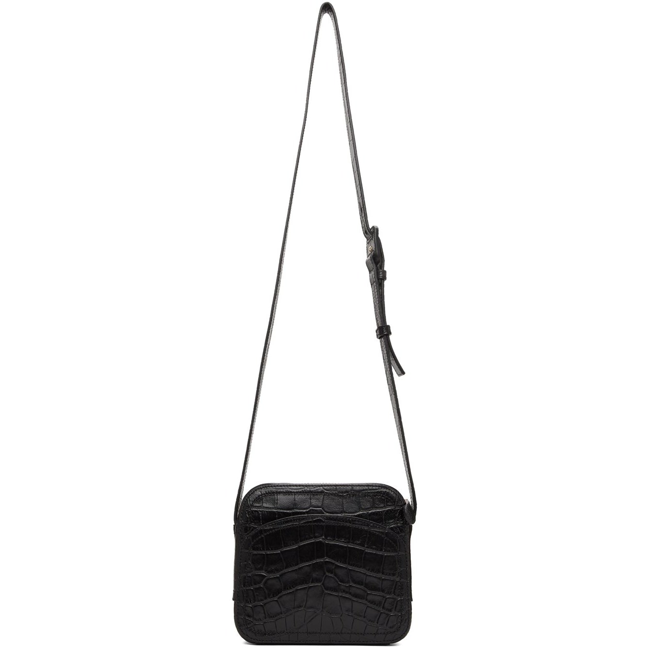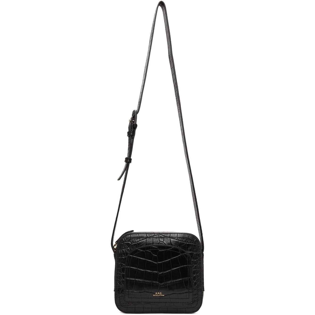Structured croc-embossed leather shoulder bag in black. Adjustable shoulder strap with post-stud fastening. Patch pocket and gold-tone logo stamp at face. Patch pocket at back face. Zip closure. Patch pocket and leather logo patch at interior. Tonal cotton twill lining. Gold-tone hardware. Approx. 6.5 length x 5.75 height x 2.5 width. Supplier color: Black Leather. Brand: A.P.C.