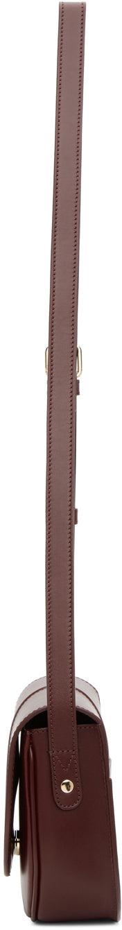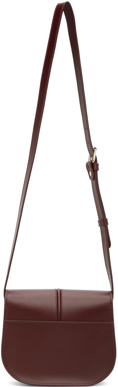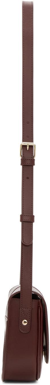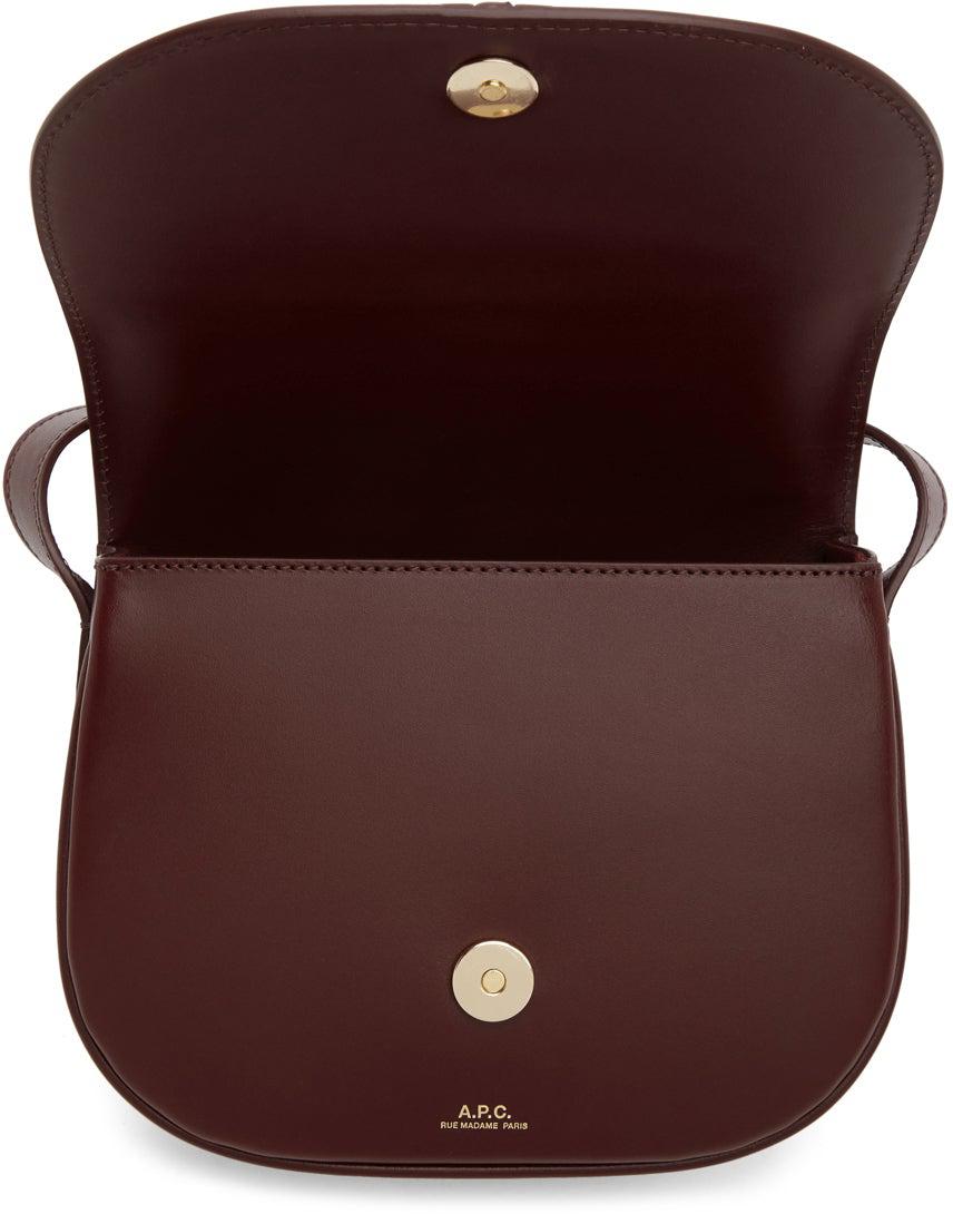 Buffed calfskin shoulder bag in burgundy. Adjustable shoulder strap with pin-buckle fastening. Gold-tone logo stamp at face. Foldover flap with magnetic press-stud fastening. Patch pocket and leather logo patch at interior. Tonal twill lining. Gold-tone hardware. Approx. 8 length x 6 height x 2.5 width. Supplier color: Wine Calfskin. Brand: A.P.C.