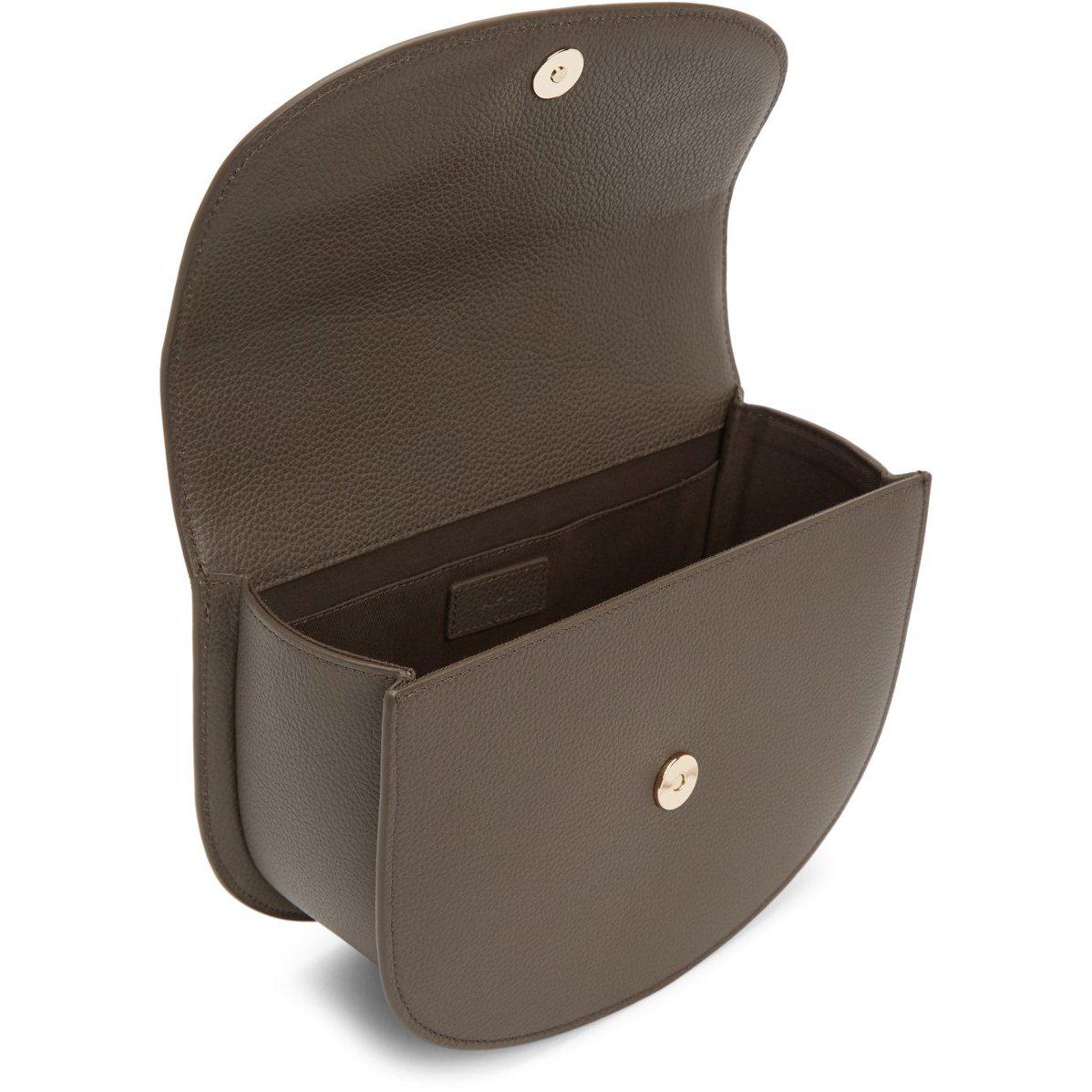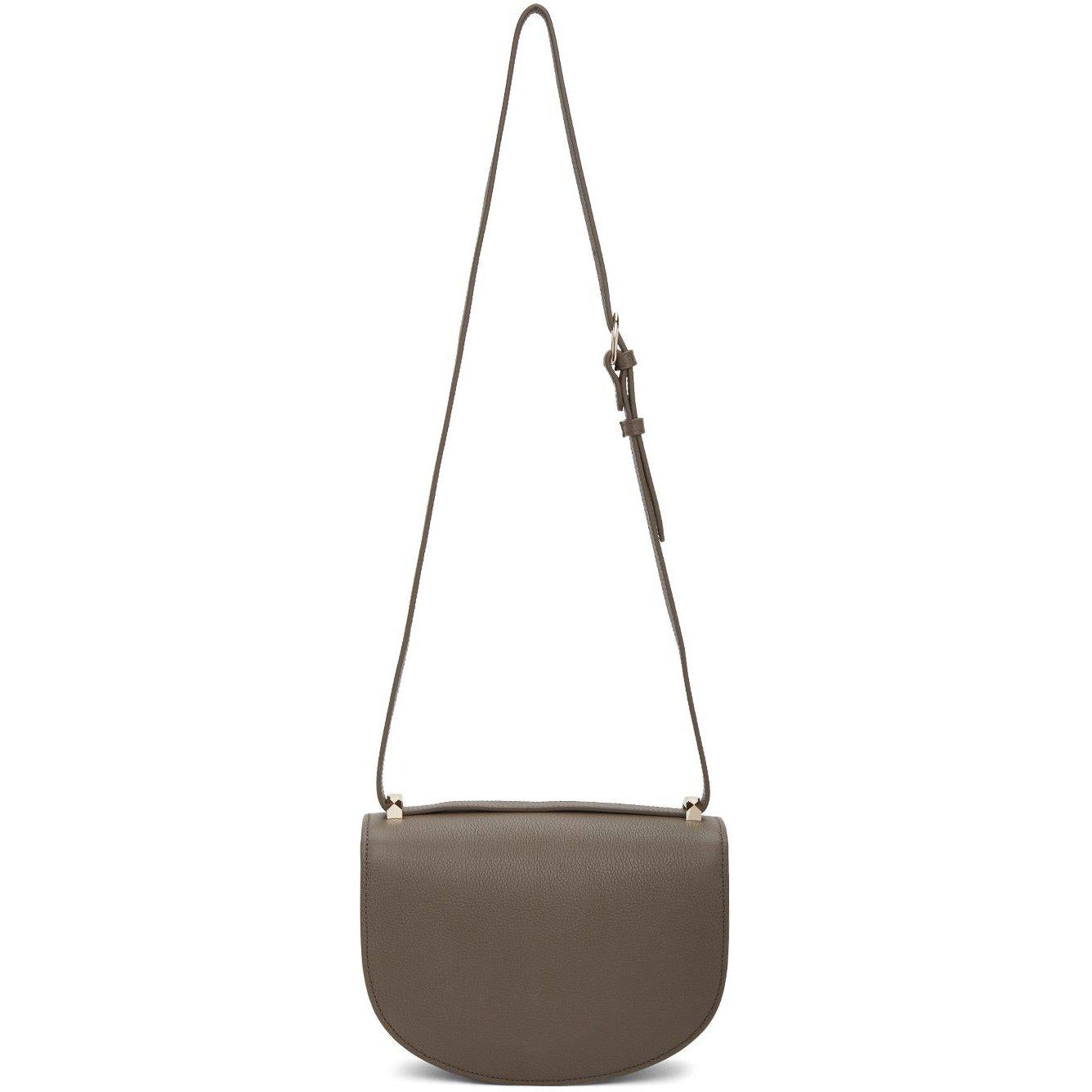 Grained leather shoulder bag in grey. Adjustable and detachable sliding leather shoulder strap with pin-buckle fastening. Logo stamp in gold-tone at face. Foldover flap with magnetic press-stud fastening. Patch pocket at interior. Tonal textile lining. Gold-tone hardware. Approx. 9.5 length x 7 height x 3 width. Supplier color: Gris Leather. Brand: A.P.C.