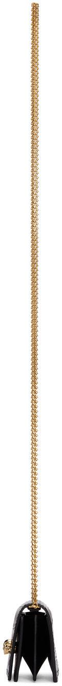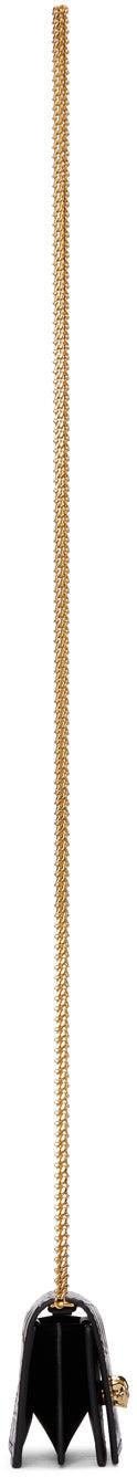 Croc-embossed calfskin shoulder bag in burgundy. Curb chain shoulder strap. Signature Swarovski crystal-embellished skull hardware at face. Foldover flap with press-stud fastening. Expansion panel at sides and base. Gold-tone logo stamp and three card slots at interior. Black buffed leather lining. Gold-tone hardware. Approx. 4 length x 3 height x 1.5 width. Supplier color: Madder Calfskin, swarovski crystal. Brand: Alexander McQueen