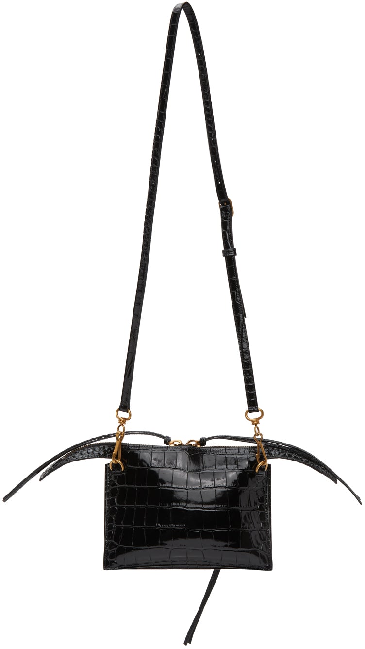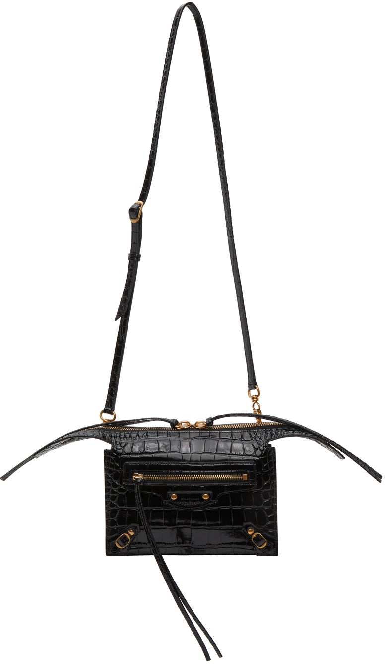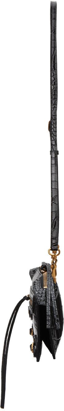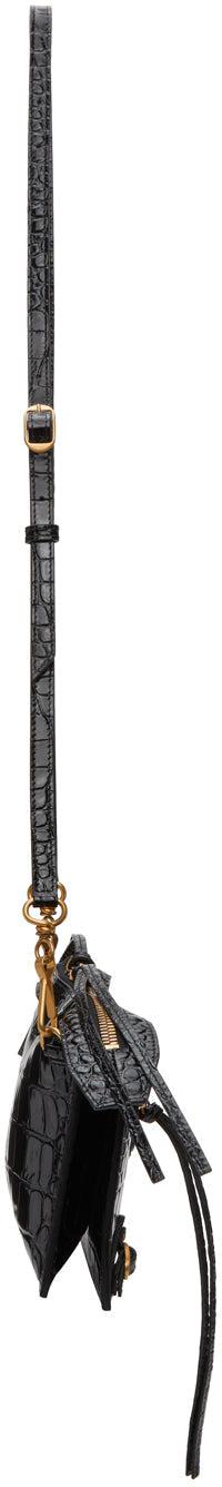 Croc-embossed leather shoulder bag in black. Adjustable and detachable pin-buckle leather shoulder strap with lanyard clasp fastening. Pin-buckle hardware and zippered pocket featuring tonal leather logo patch at face. Two-way zip closure. Embossed logo, one note slot, and two card slots at two compartment interior. Tonal buffed leather lining. Antiqued gold-tone hardware. Approx. 7.75 length x 6 height x 0.5 width. Supplier color: Black Leather. Brand: Balenciaga