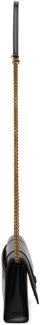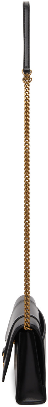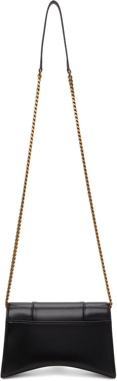 Polished calfskin shoulder bag in black. Detachable curb chain shoulder strap with leather strap pad. Logo hardware at face. Patch pocket at back face. Curved base. Foldover flap with magnetic press-stud fastening. Gold-tone logo stamp and patch pocket at interior. Tonal nappa lambskin lining. Antiqued gold-tone hardware. Approx. 9 length x 5.25 height x 2 width. Supplier color: Black Calfskin. Brand: Balenciaga