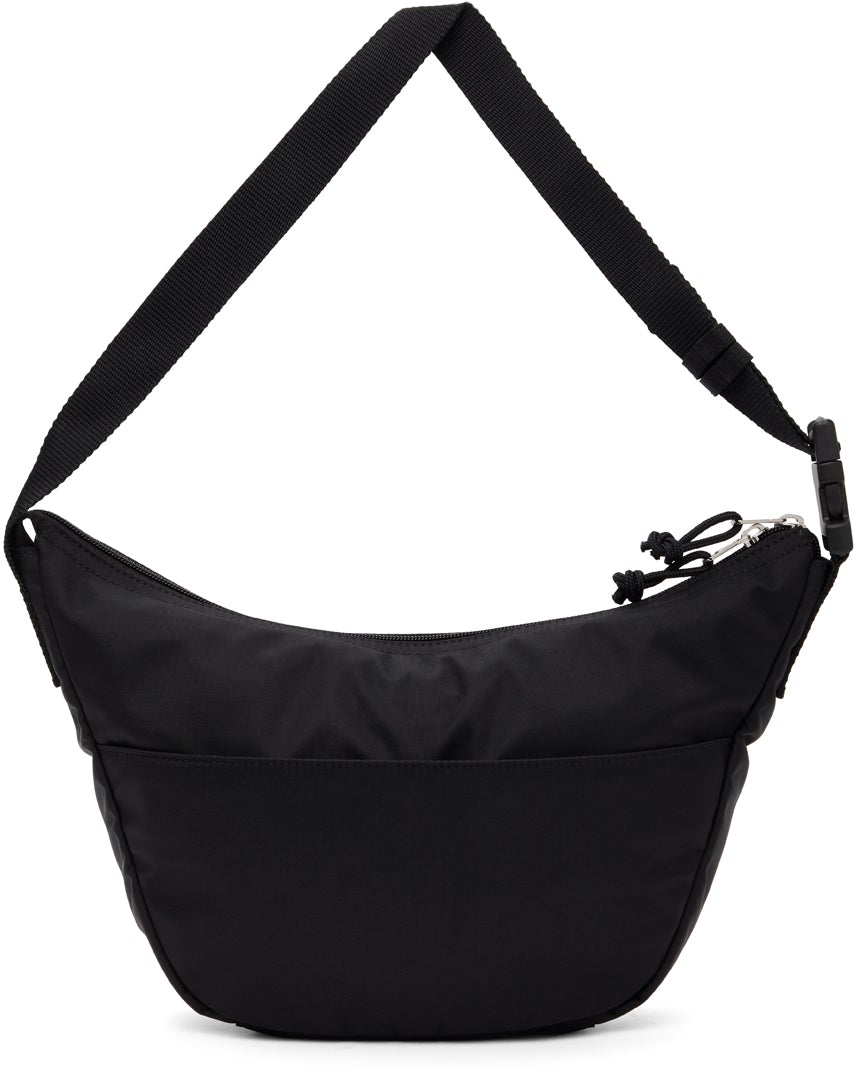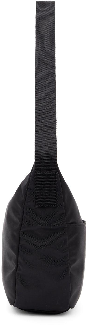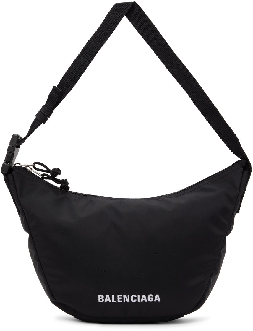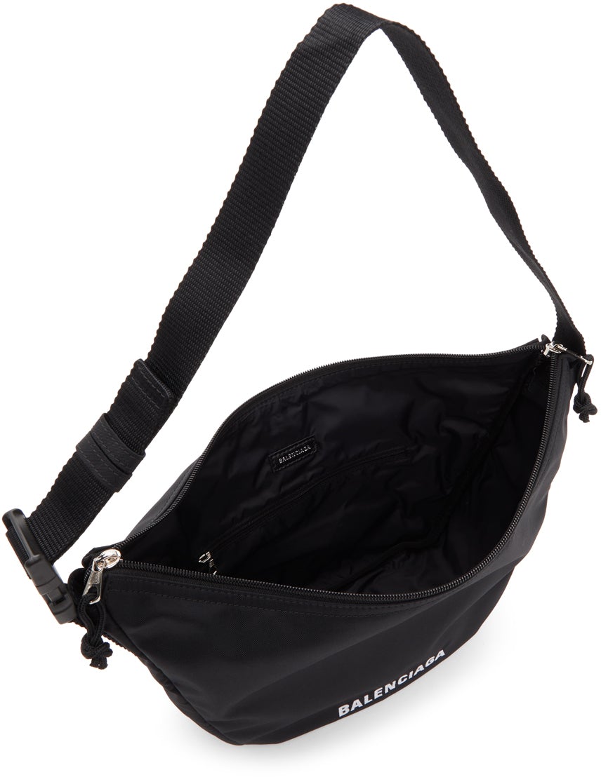 Recycled nylon satin shoulder bag in black. Adjustable tonal webbing shoulder strap with press-release fastening. Logo embroidered in white at face. Patch pocket with magnetic fastening at back face. Two-way zip closure. Tonal embossed leather logo patch and zippered pocket at interior. Tonal textile interior. Silver-tone hardware. Approx. 14.5 length x 8 height x 3.5 width. Supplier color: Black Textile. Brand: Balenciaga