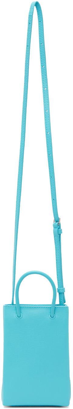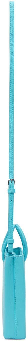 Textured calfskin shoulder bag in blue. Twin rolled lambskin carry handles at top. Adjustable shoulder strap with pin-buckle fastening. Logo printed in white at face. Magnetic press-stud tab fastening at throat. Leather logo patch and patch pocket at interior. Textile lining in black. Silver-tone hardware. Approx. 5 length x 7 height x 1.5 width. Supplier color: Azure tonal Calfskin, lambskin. Brand: Balenciaga