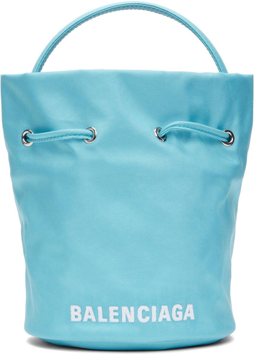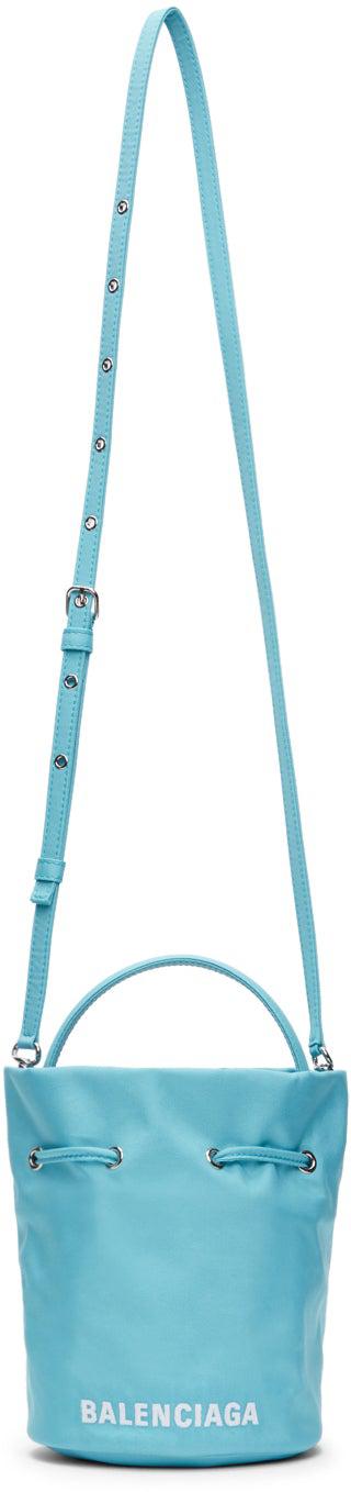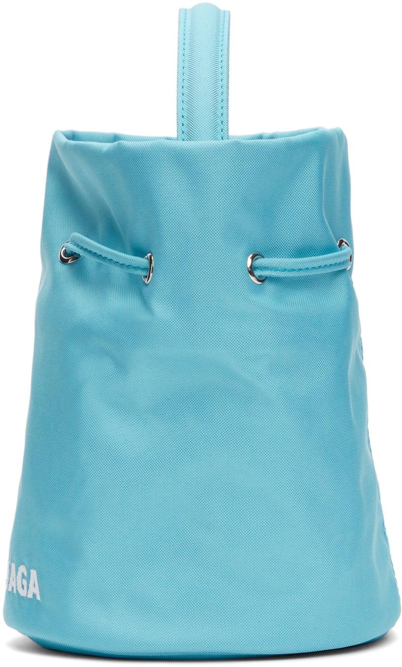 Recycled nylon canvas shoulder bag in blue. Carry handle at top. Adjustable and detachable shoulder strap with pin-buckle and lanyard clasp fastening. Logo embroidered in white at face. Drawstring at throat. Silver-tone logo stamp and patch pocket at interior. Tonal taffeta lining. Silver-tone hardware. Approx. 5.75 length x 7.5 height x 5.75 width. Supplier color: Azur/White Textile. Brand: Balenciaga