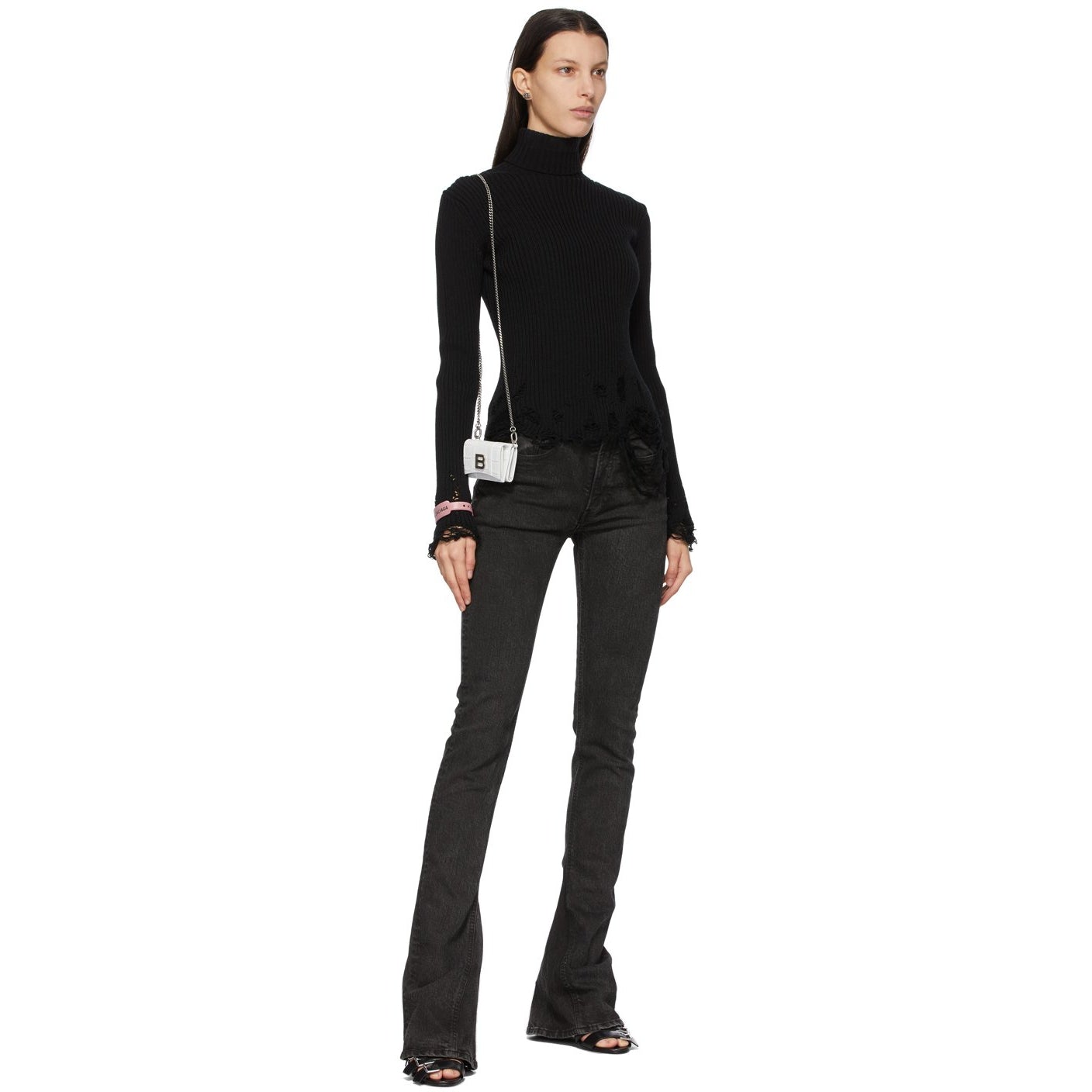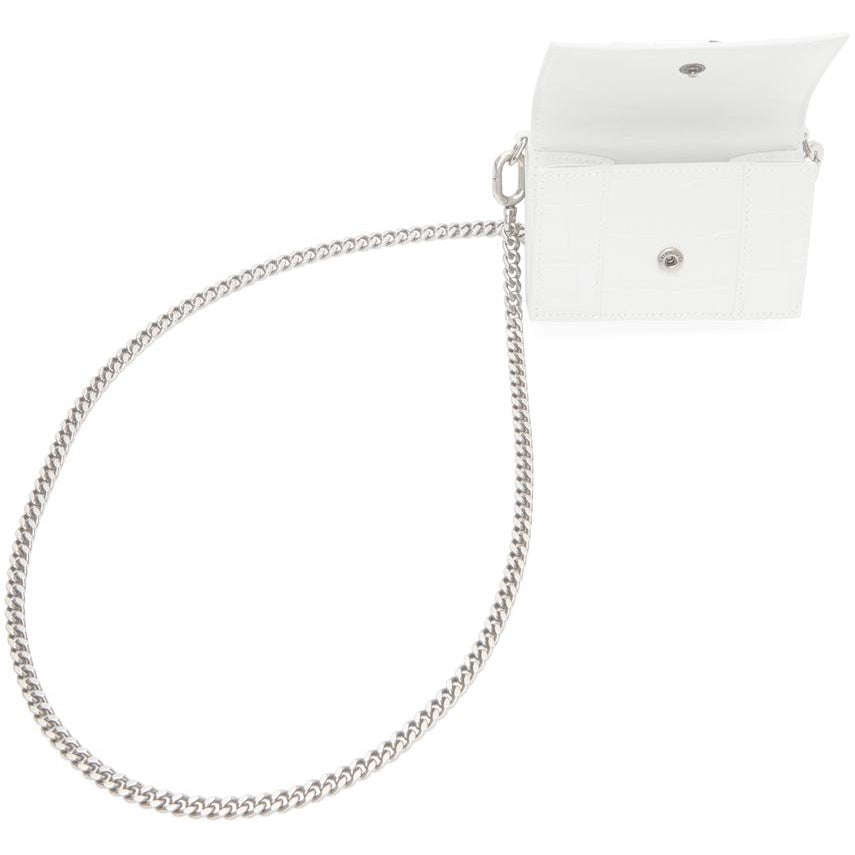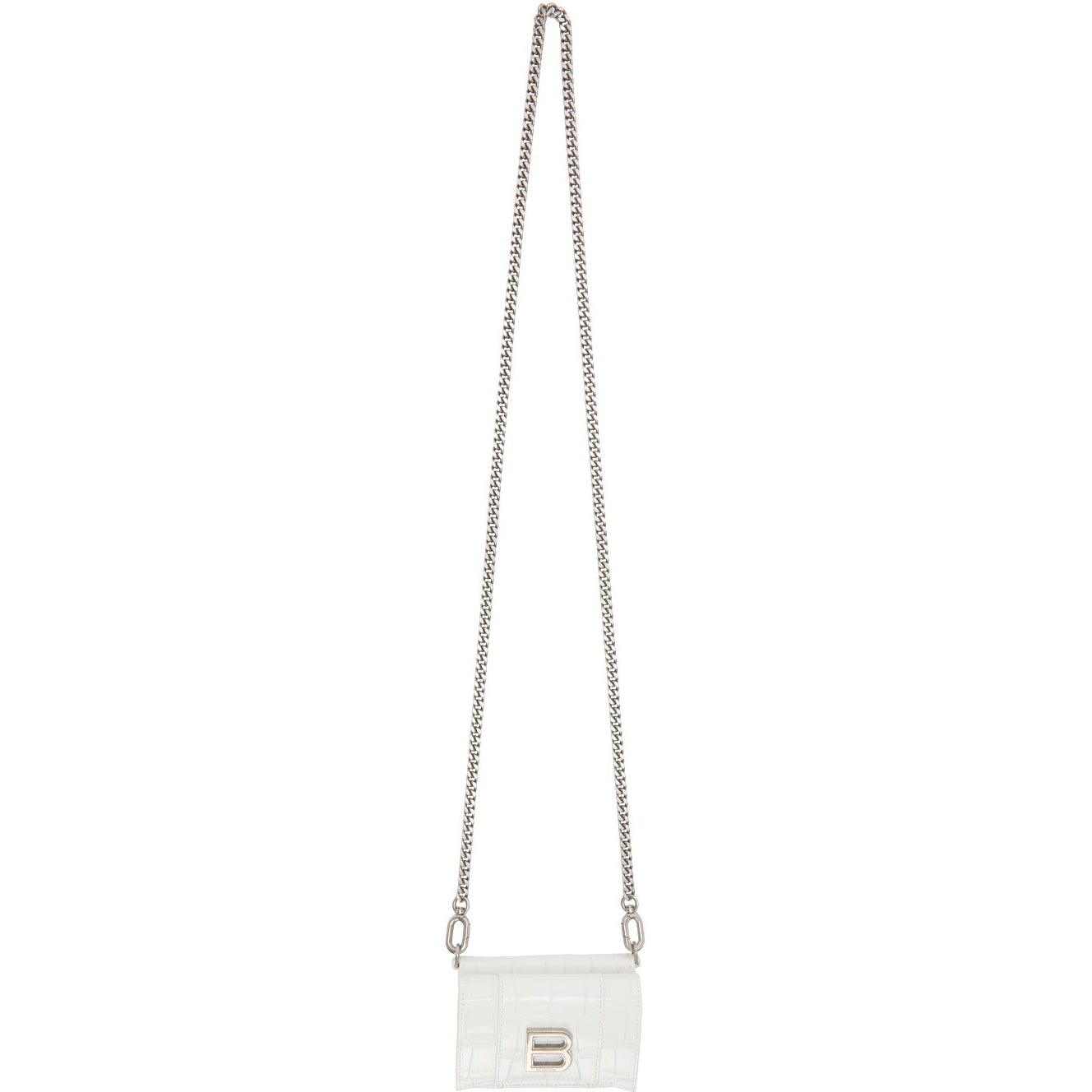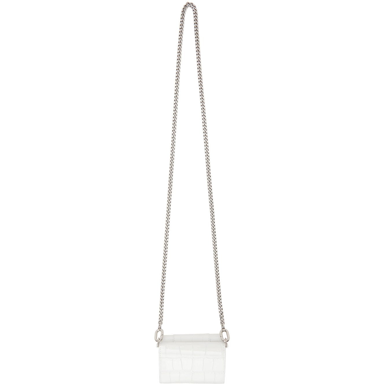 Croc-embossed calfskin shoulder bag in white. Detachable curb chain shoulder strap with lanyard clasp fastening. Logo hardware at face. Foldover flap with magnetic press-stud fastening. Three card slots, coin pouch, note slot, and silver-tone logo stamp at interior. Tonal grained leather lining. Antiqued silver-tone hardware. Approx. 3.75 length x 2.75 height x 1.5 width. Supplier color: White Calfskin. Brand: Balenciaga
