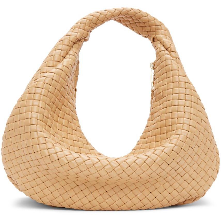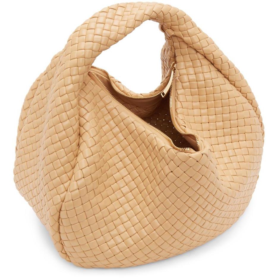 Intrecciato-woven nappa lambskin shoulder bag in beige. Fixed shoulder strap. Zip closure. Tonal leather logo flag at interior. Unlined. Gold-tone hardware. Approx. 13.5 length x 12 height x 9.5 width. Supplier color: Almond Lambskin. Brand: Bottega Veneta