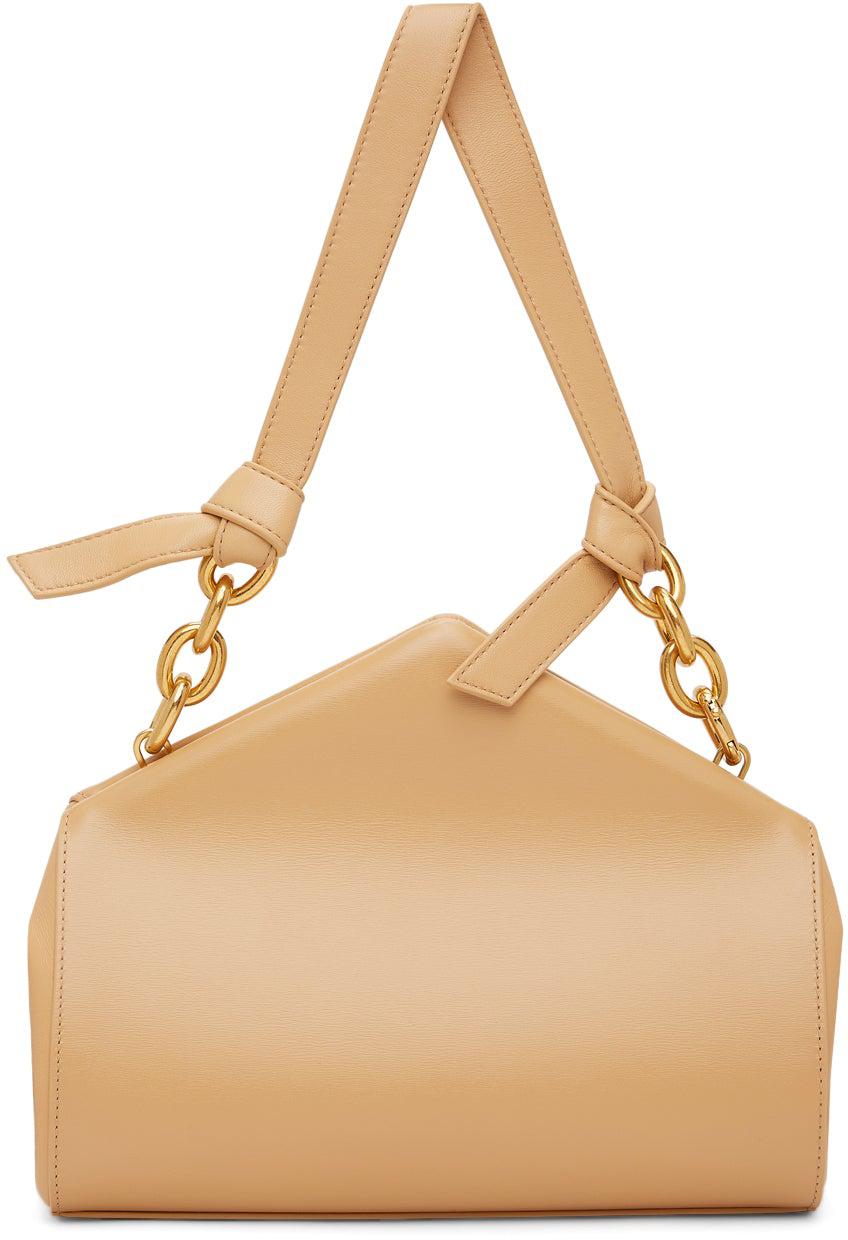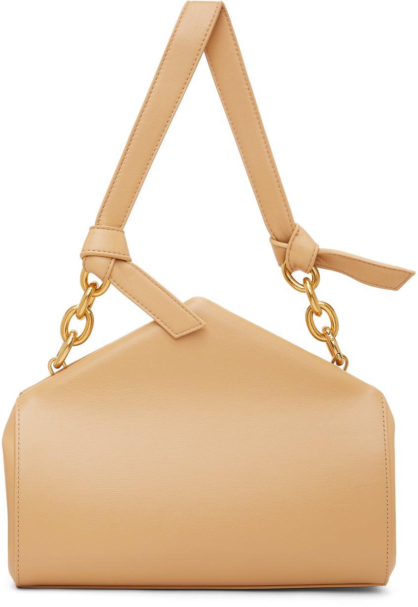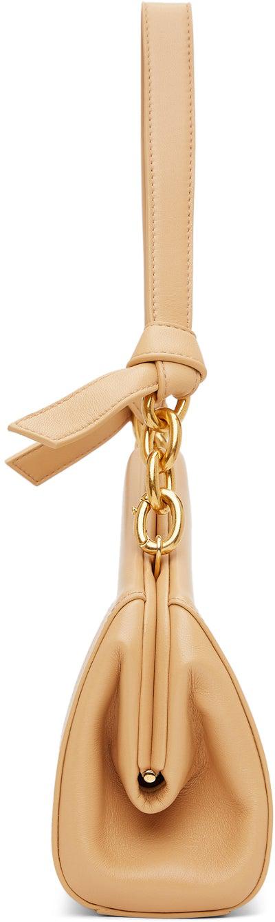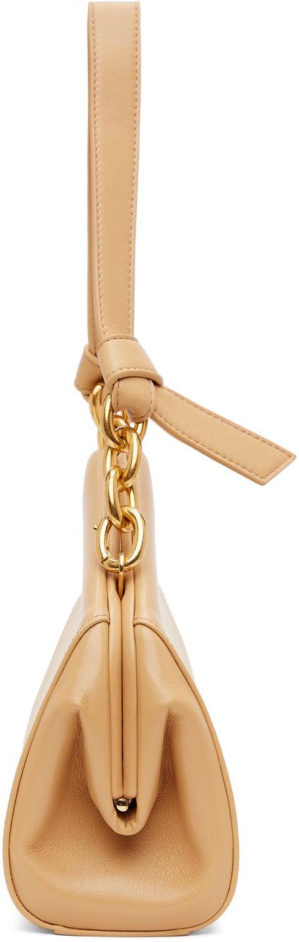 Buffed calfskin shoulder bag in beige. Detachable leather and curb chain shoulder strap with knotted detailing and hinged-ring fastening. Magnetic closure at hinged opening. Embossed logo and patch pocket at interior. Tonal nappa lambskin lining. Gold-tone hardware. Approx. 9.5 length x 4.25 height x 3 width. Supplier color: Almond Calfskin. Brand: Bottega Veneta