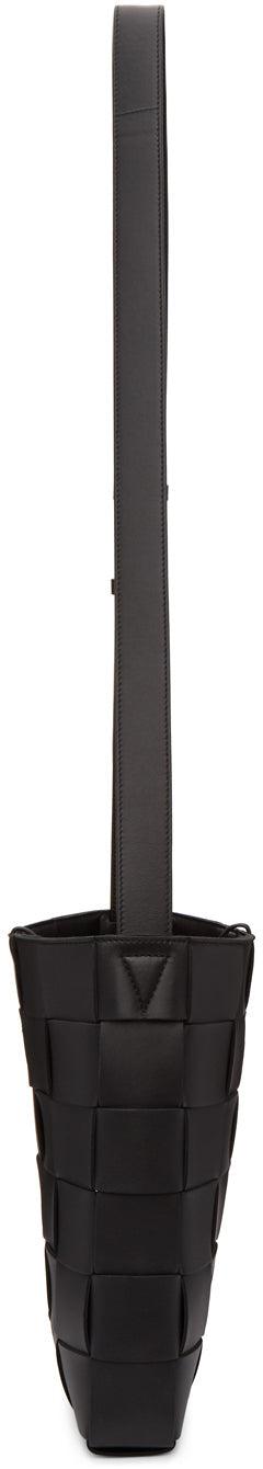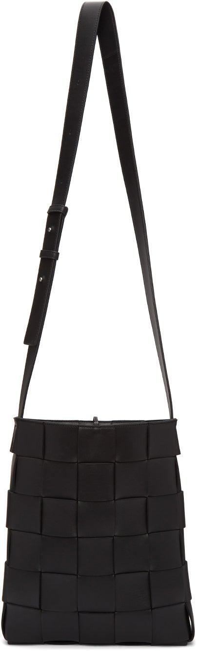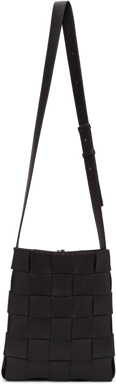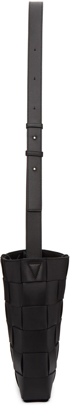 Intrecciato-woven nappa lambskin messenger bag in black. Adjustable shoulder strap with pin-buckle fastening. Tonal leather drawstring at throat. Zippered pocket, patch pocket, and embossed logo at interior. Unlined. Tonal and gunmetal-tone hardware. Approx. 9.5 length x 11 height x 2.25 width. Supplier color: Black Lambskin. Brand: Bottega Veneta