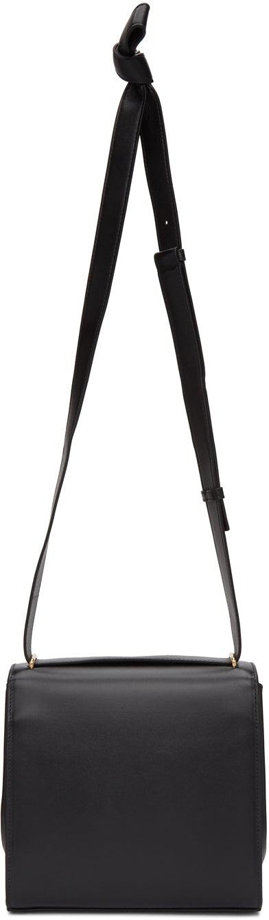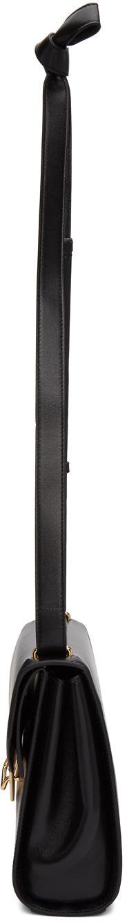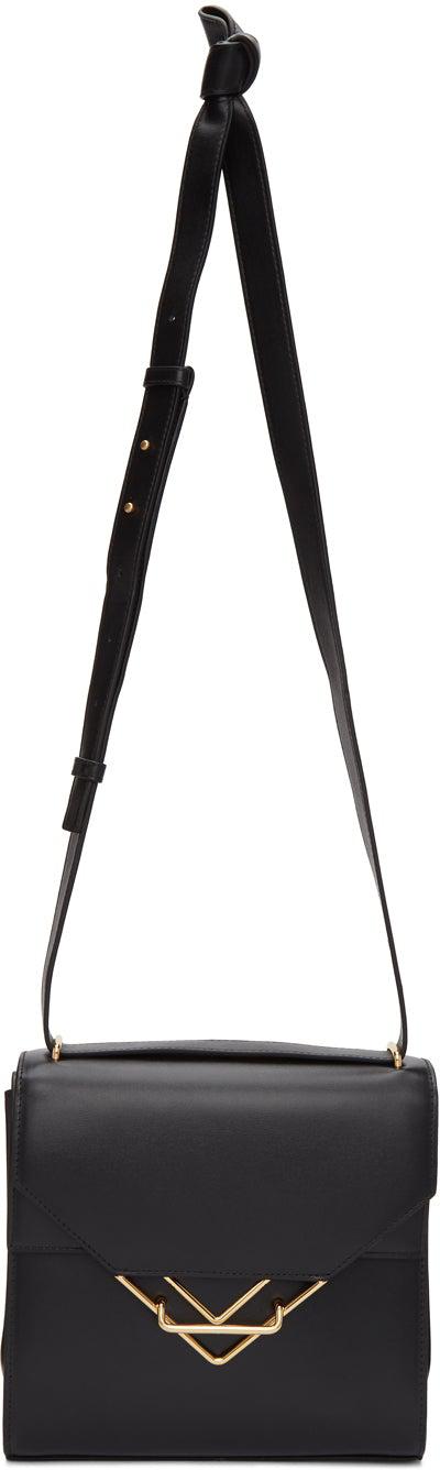 Buffed calfskin shoulder bag in black. Adjustable and detachable sliding shoulder strap with post-stud fastening. Concealed flap pocket at face. Foldover flap with tab-slot fastening. Zippered pocket and embossed logo at interior. Tonal leather lining. Gold-tone hardware. Approx. 9†length x 9†height x 3.5†width. Supplier color: Black Calfskin. Brand: Bottega Veneta