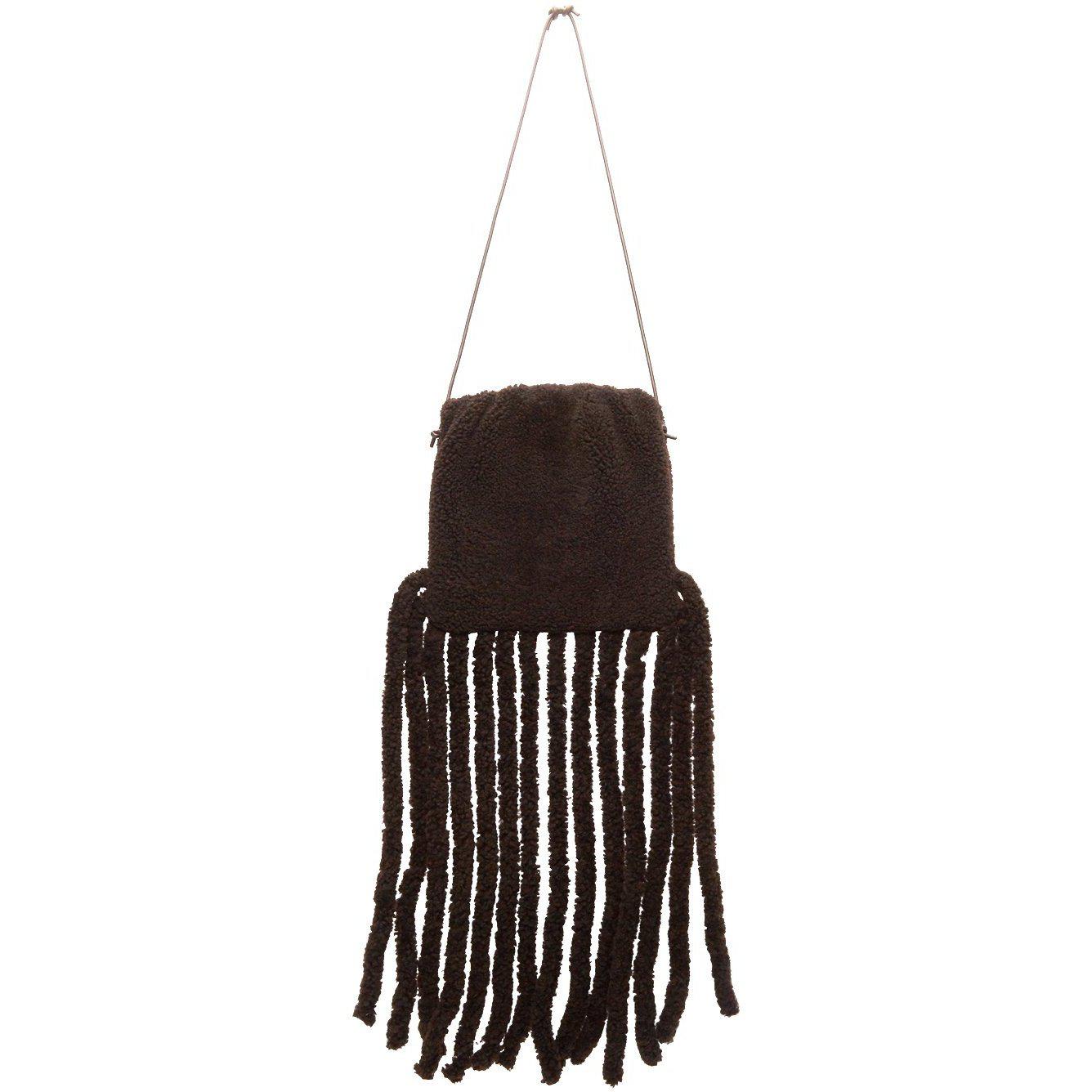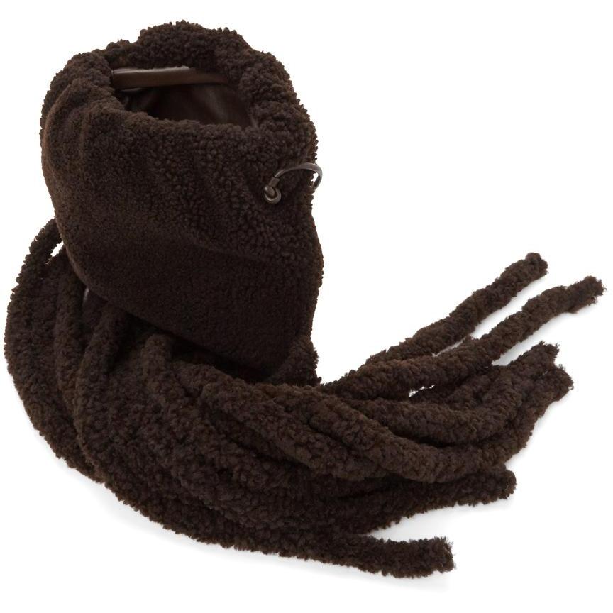 Shearling shoulder bag in brown. Adjustable leather shoulder strap with pull-through fastening. Tonal fringed detailing at base. Hinged closure. Two patch pockets at interior. Tonal buffed leather lining. Gold-tone hardware. Approx. 12.5 length x 11.5 height x 3 width. Supplier color: Fondant Lambskin, leather. Brand: Bottega Veneta