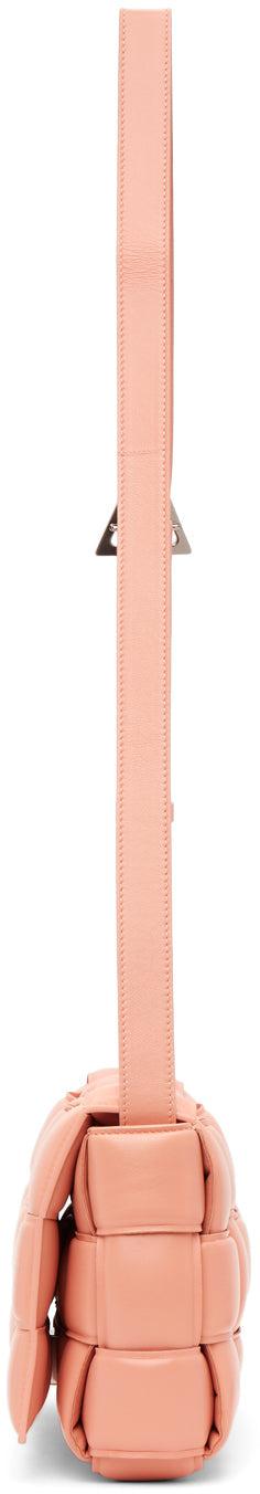 Padded intrecciato-woven lambskin shoulder bag in pink. Adjustable shoulder strap with pin-buckle fastening. Foldover flap with tab-slot fastening. Zippered pocket and embossed logo at interior. Tonal lambskin lining. Logo-engraved silver-tone hardware. Approx. 10.5 length x 7 height x 3.5 width. Supplier color: Peachy Lambskin. Brand: Bottega Veneta