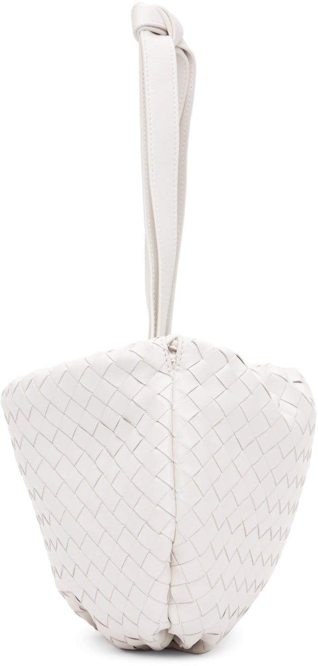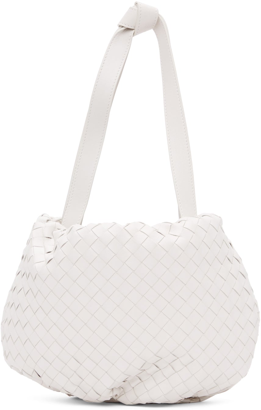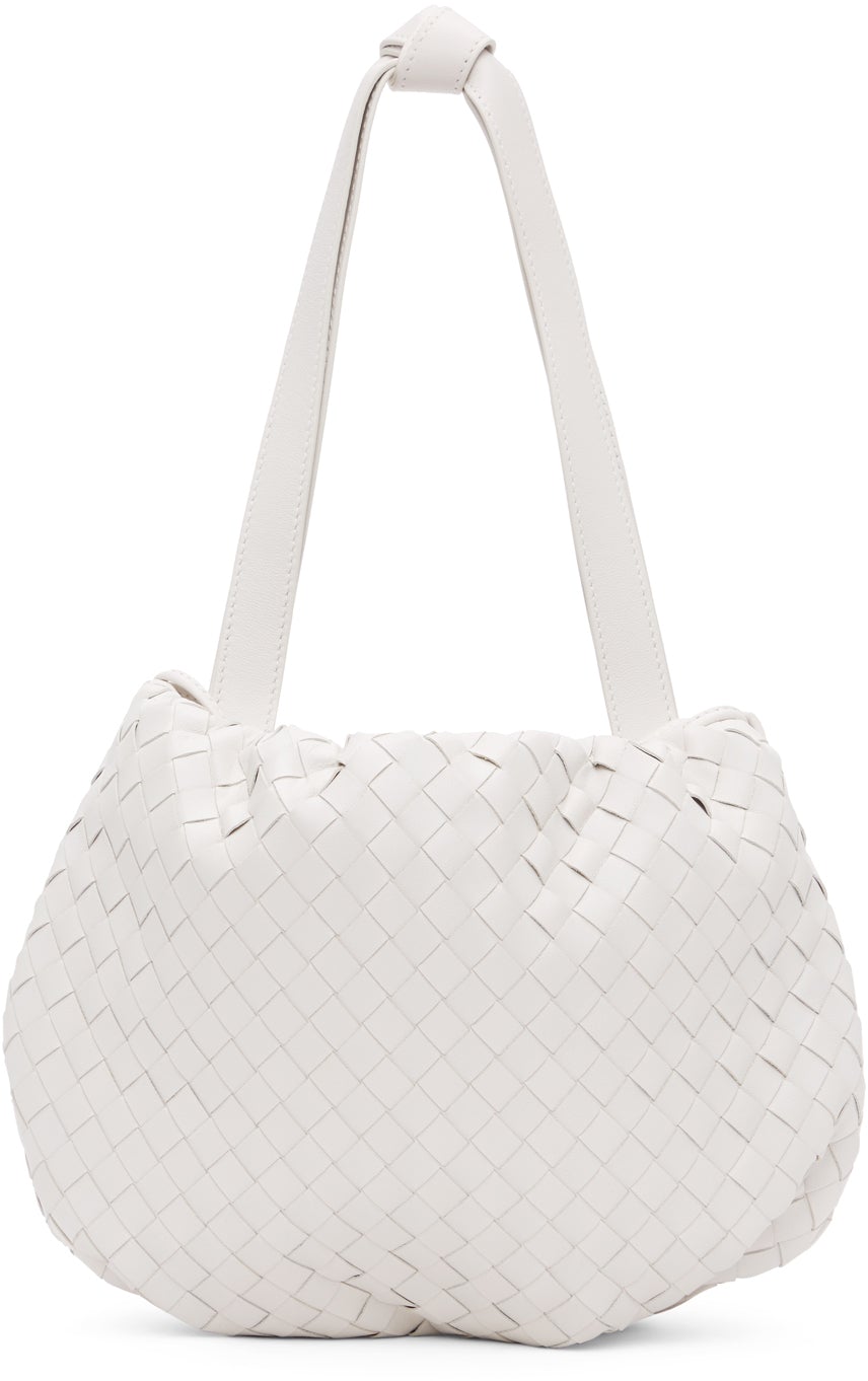 Intrecciato-woven lambskin shoulder bag in white. Detachable twin carry handles with knotted detailing at top. Drawstring fastening at throat. Logo embossed at interior. Tonal buffed lambskin lining. Gold-tone hardware. Supplier color: Chalk Lambskin. Brand: Bottega Veneta