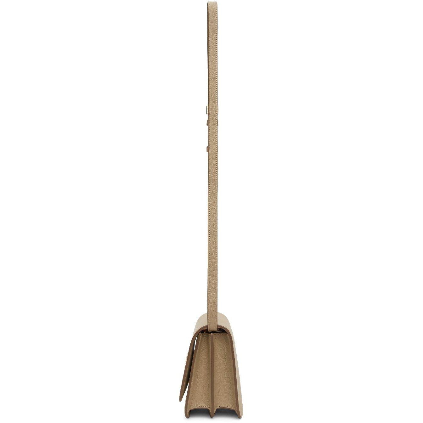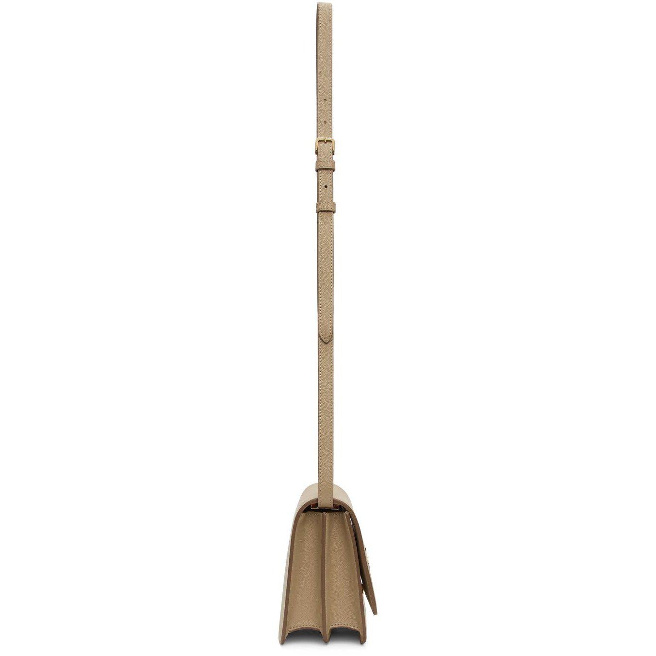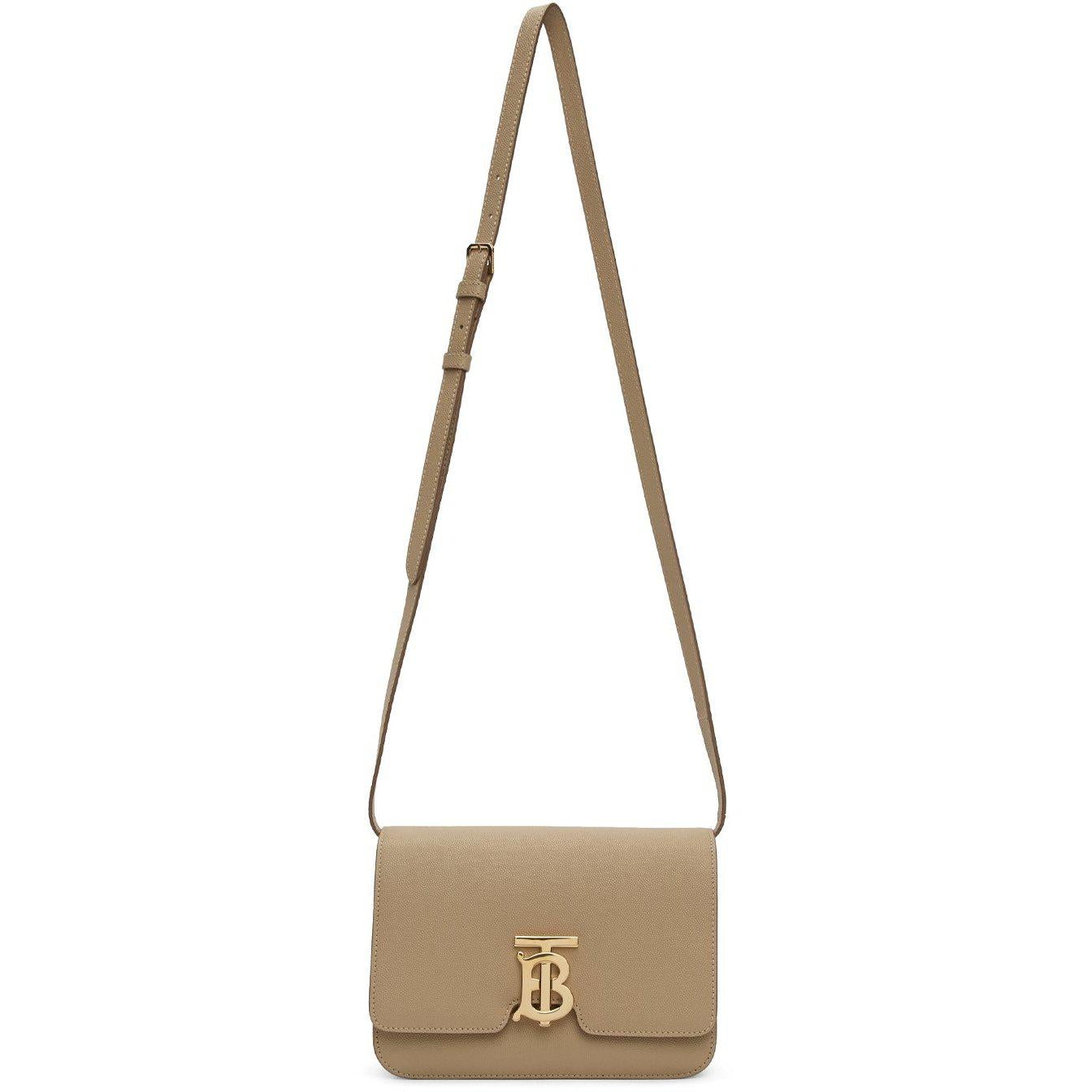 Pebble grained calfskin shoulder bag in beige. Adjustable and detachable leather shoulder strap with pin-buckle fastening. Foldover flap with logo hardware at flip-clasp fastening. Zippered pocket at two-compartment interior. Tonal leather lining. Gold-tone hardware. Approx. 8.5 length x 6 height x 3 width. Supplier color: Archive beige Calfskin. Brand: Burberry