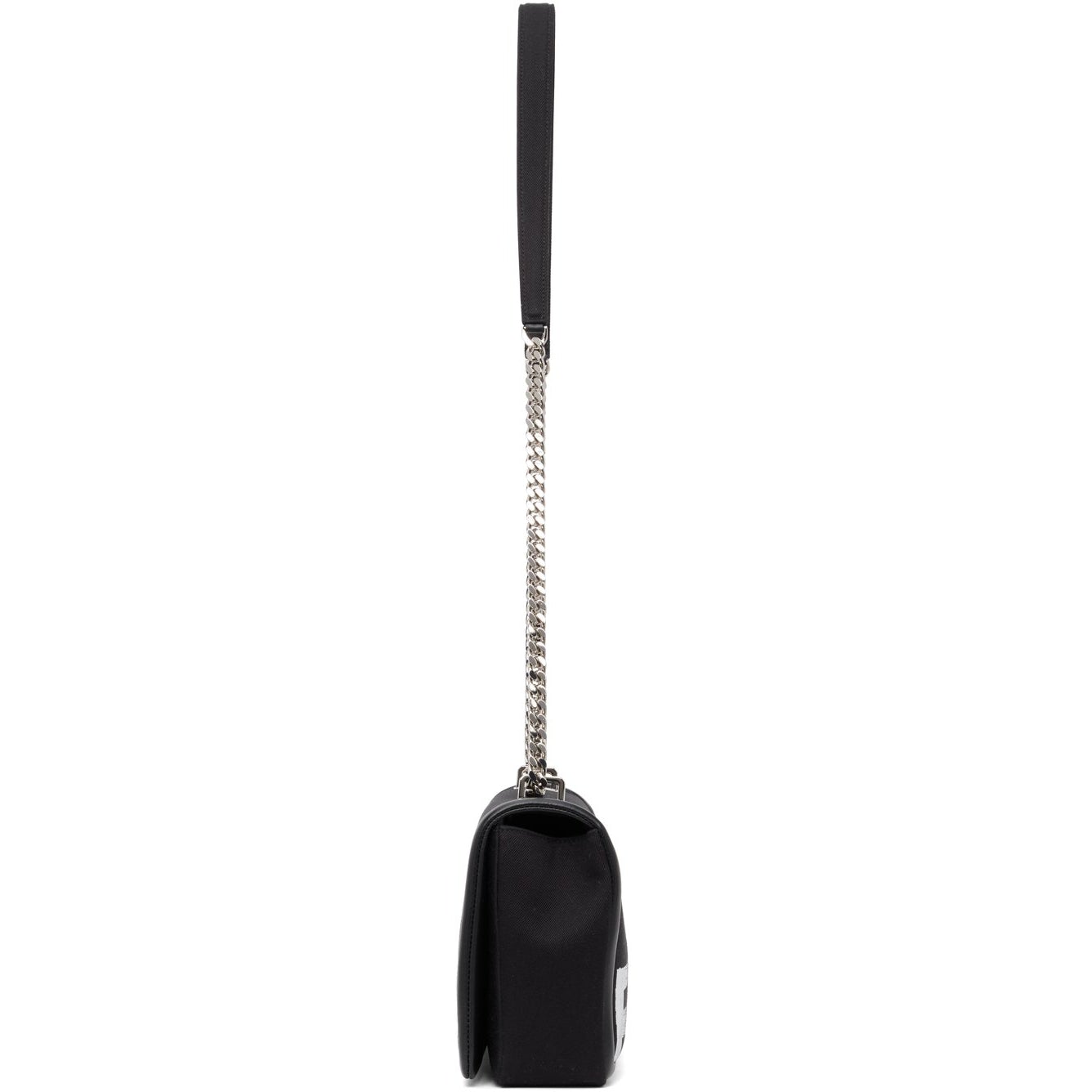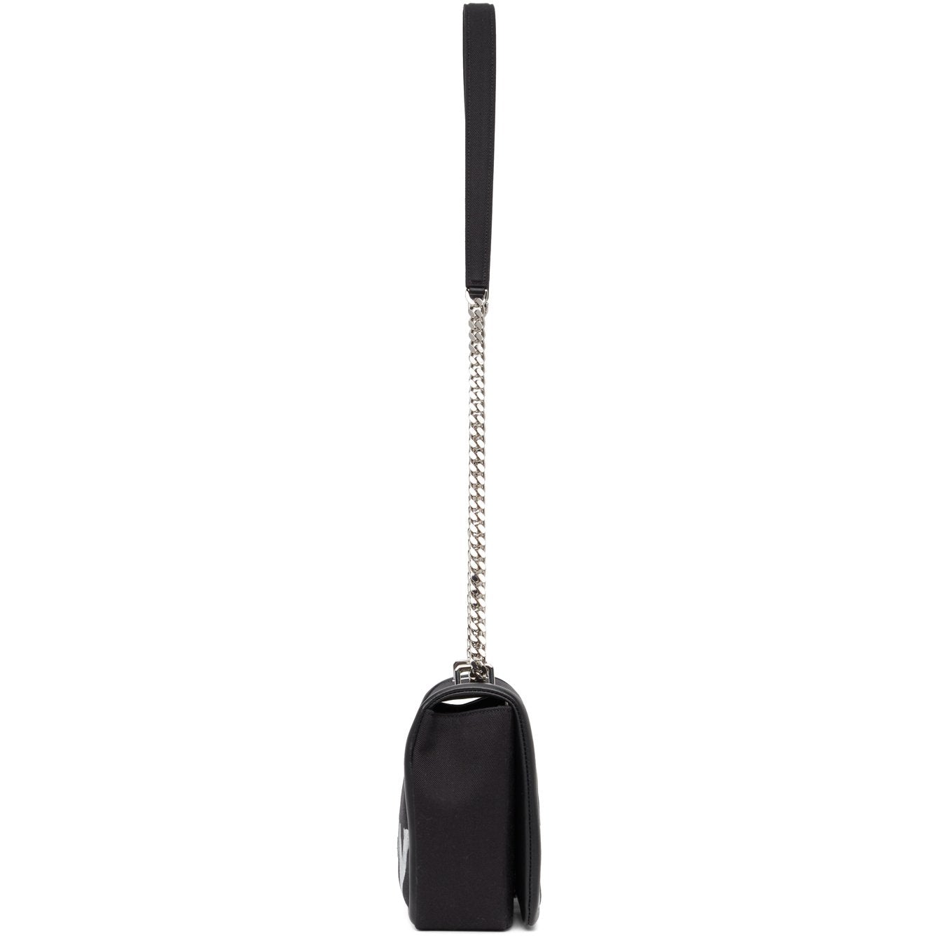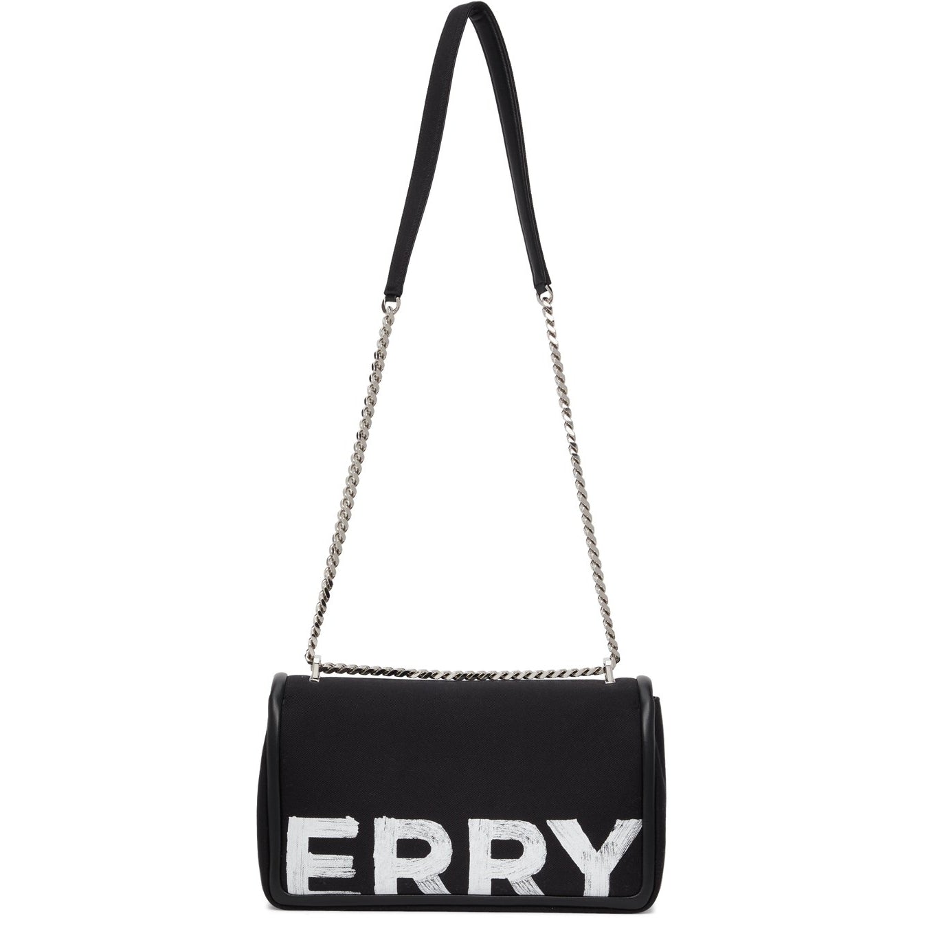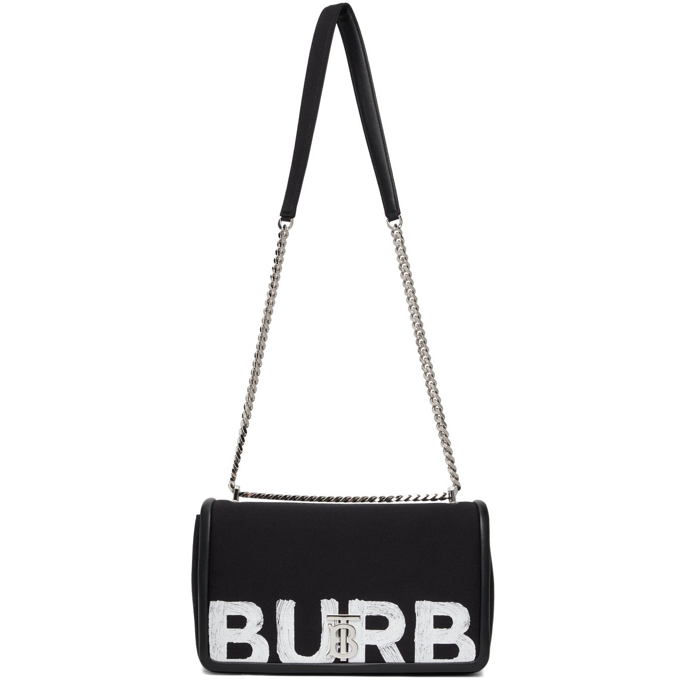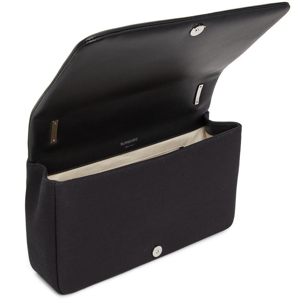 Cotton canvas shoulder bag in black featuring tonal lambskin trim. Sliding curb chain shoulder strap with buffed lambskin strap pad. Logo plaque at face. Logo printed in white at face and back face. Foldover flap with magnetic press-stud fastening. Logo stamp in silver-tone and zippered pocket at interior. Canvas lining in beige. Silver-tone hardware. Approx. 11 length x 7 height x 2.5 width. Supplier color: Black/White Textile, lambskin. Brand: Burberry