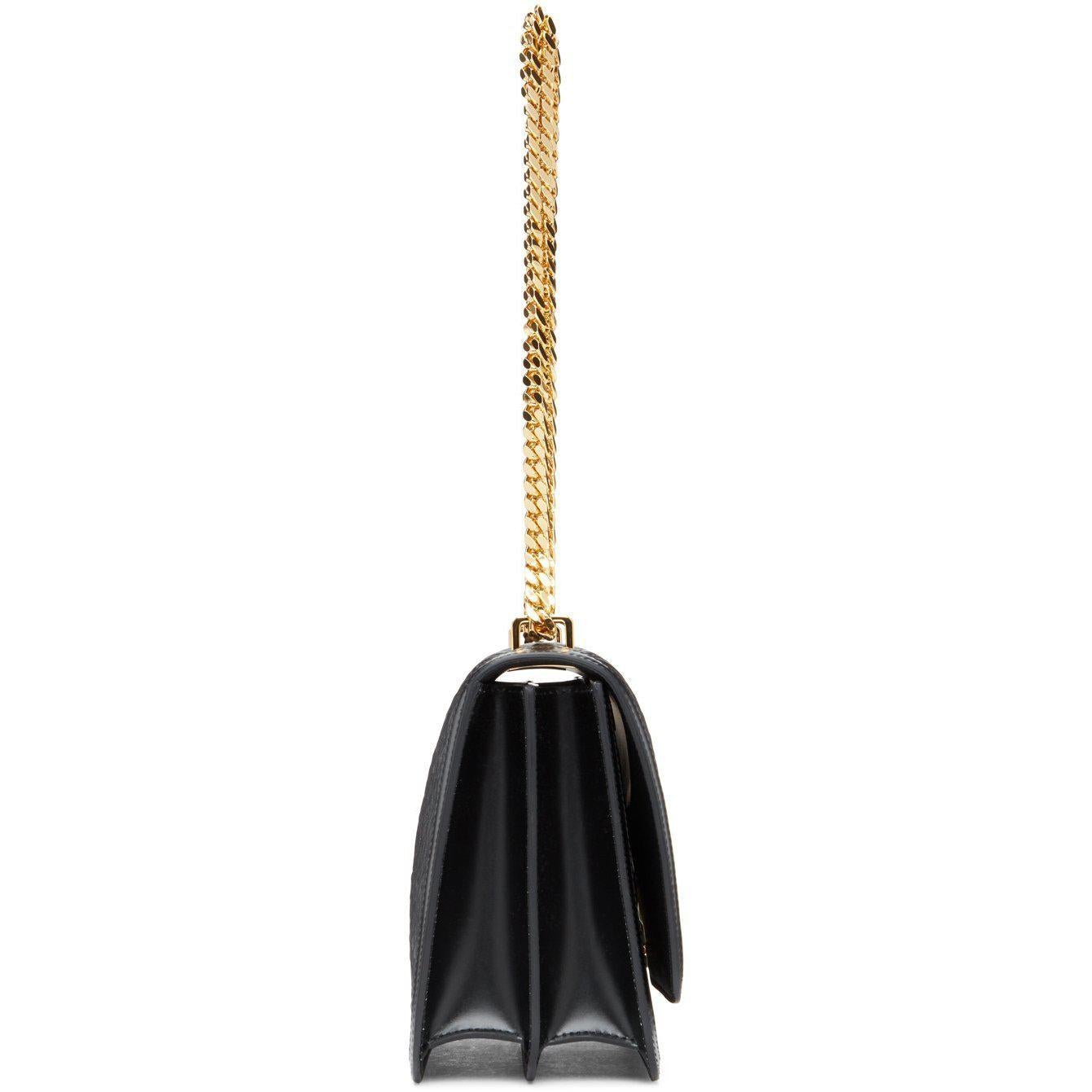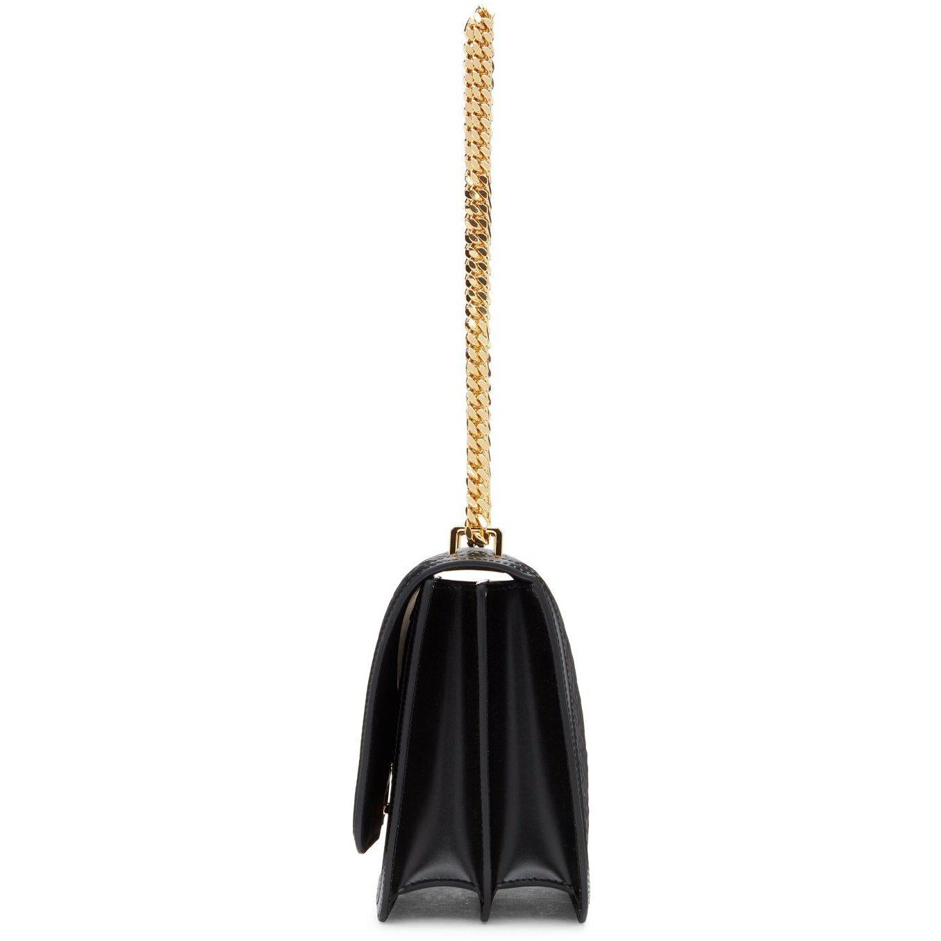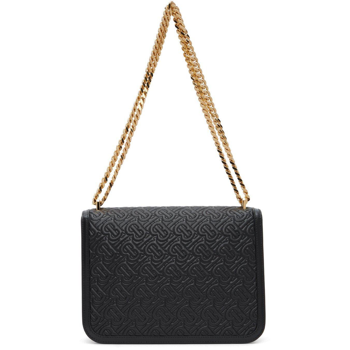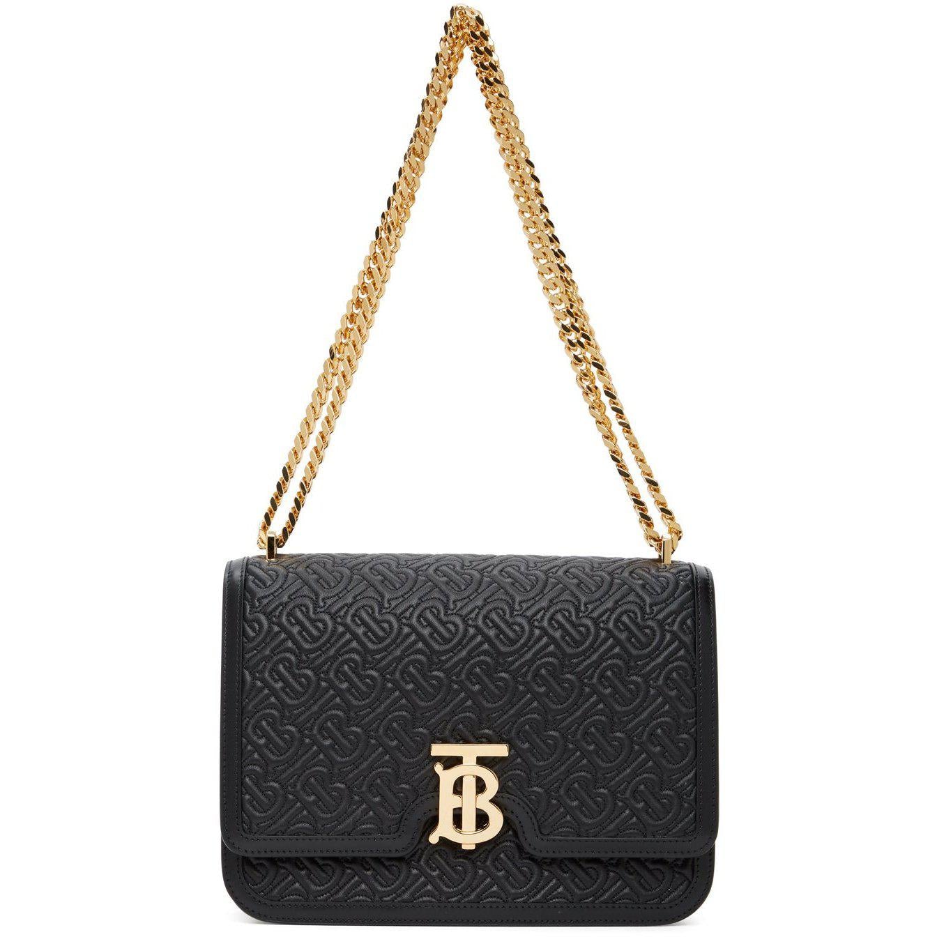 Quilted lambskin shoulder bag in black featuring logo pattern throughout. Adjustable curb chain shoulder strap. Logo plaque at face. Foldover flap with magnetic flip-clasp fastening. Logo-embossed zippered pocket at two-compartment interior. Tonal leather lining. Gold-tone hardware. Approx. 10 length x 7 height x 4 width. Supplier color: Black Lambskin. Brand: Burberry