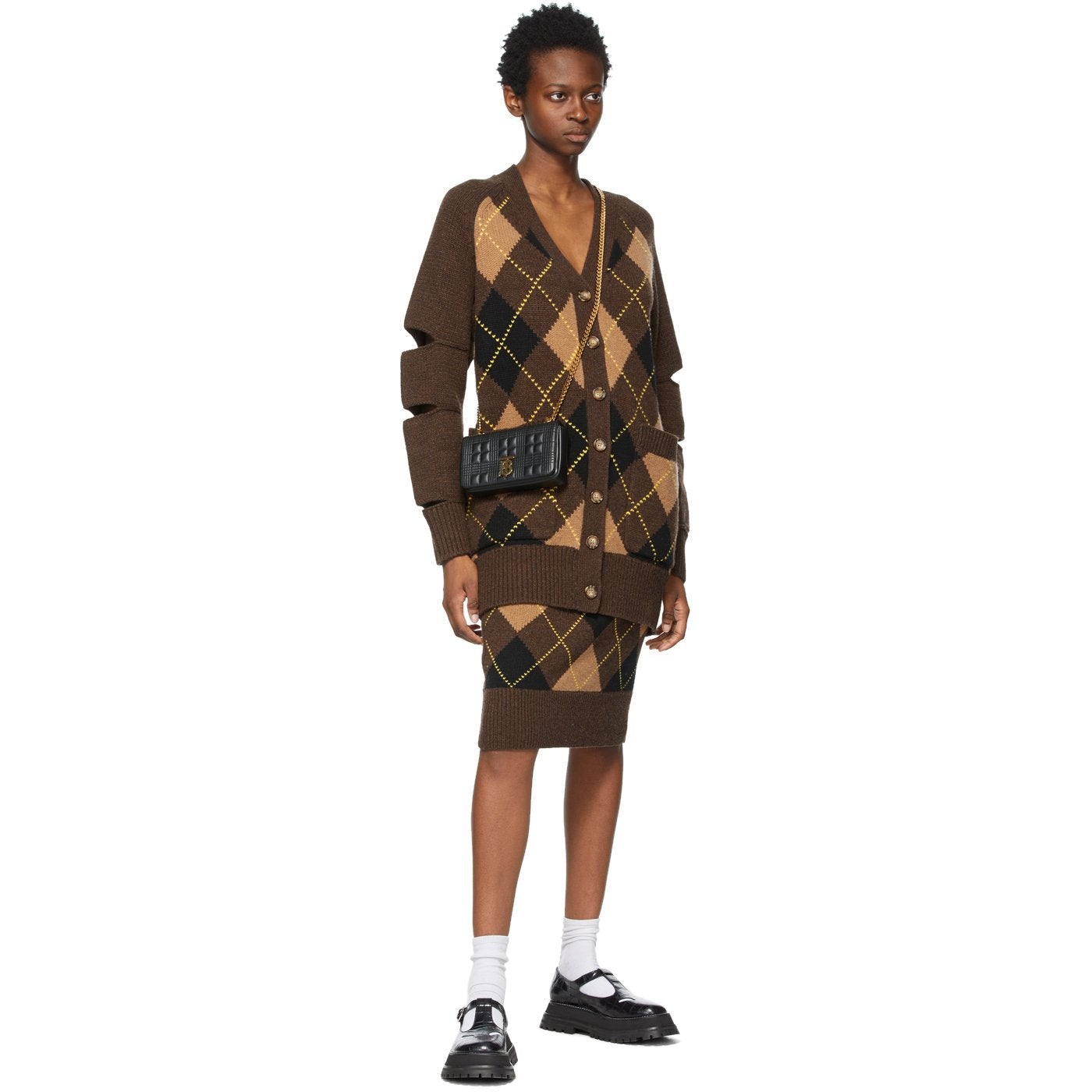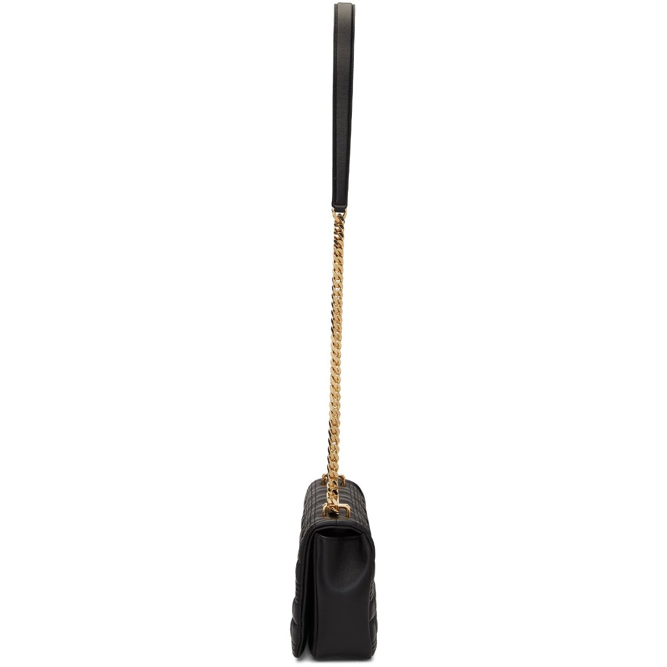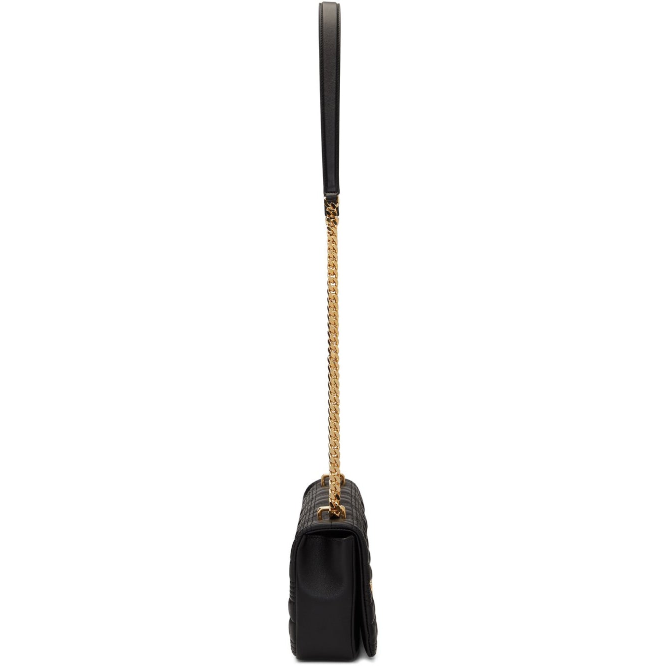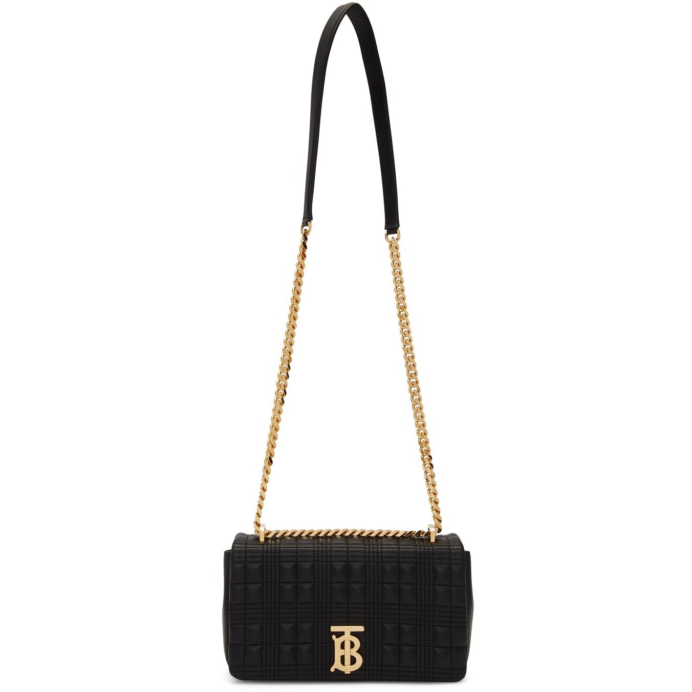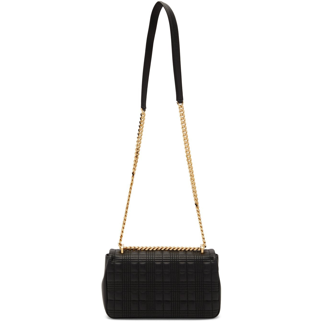 Grained calfskin shoulder bag in black. Quilted pattern throughout. Adjustable curb chain shoulder strap. Logo hardware at face. Foldover flap with magnetic press-stud fastening. Patch pocket at interior. Tonal twill lining. Gold-tone hardware. Approx. 9 length x 5 height x 2.5 width. Supplier color: Black Calfskin. Brand: Burberry