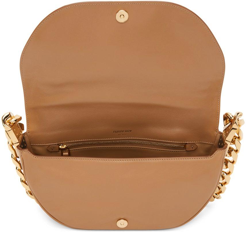 Buffed lambskin shoulder bag in tan. Burnished edges in brown throughout. Fixed curb chain shoulder strap. Zippered pocket and gold-tone logo stamp at face. Foldover flap with magnetic press-stud fastening. Zippered pocket and gold-tone logo stamp at interior. Tonal buffed lambskin lining. Logo-engraved gold-tone hardware. Approx. 11 length x 6 height x 3 width. Supplier color: Camel Lambskin. Brand: Burberry