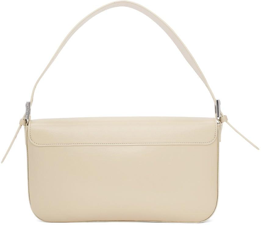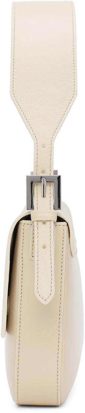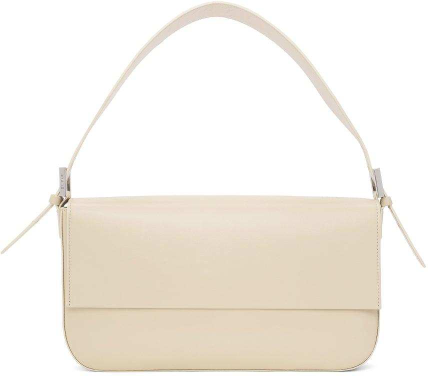 Crinkled lambskin shoulder bag in beige. Adjustable shoulder strap with pin-buckle fastening. Foldover flap with magnetic press-stud fastening. Patch pocket and leather logo patch at interior. Tonal cotton twill lining. Silver-tone hardware. Approx. 11.5 length x 6.5 height x 1.75 width. Supplier color: Ivory Lambskin. Brand: BY FAR