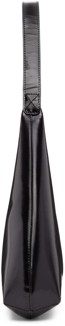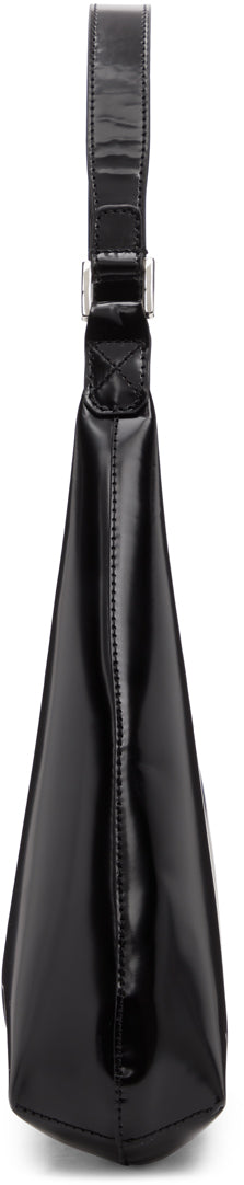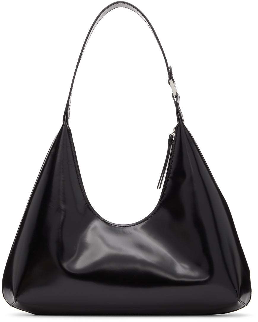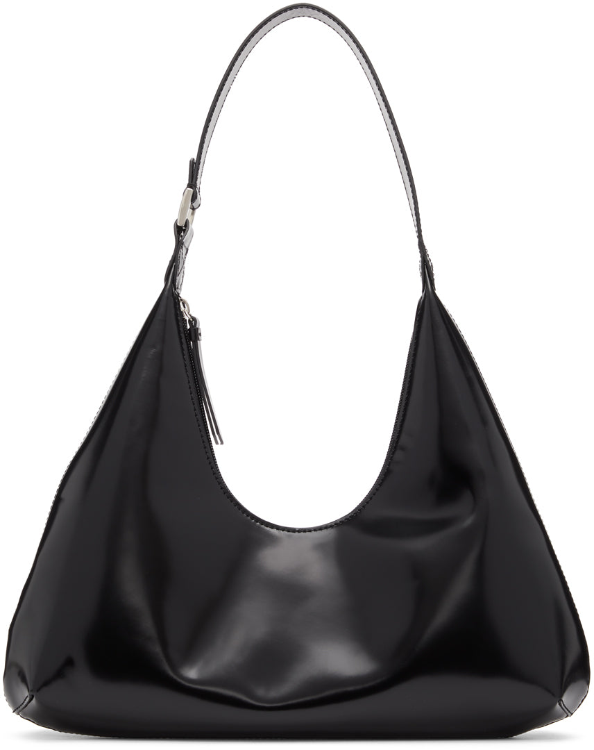Patent leather shoulder bag in black. Fixed strap at top. Zip closure. Three patch pockets and embossed leather logo patch at interior. Cotton twill lining in off-white. Silver-tone hardware. Approx. 13.5 length x 11 height x 3 width. Supplier color: Black Leather. Brand: BY FAR