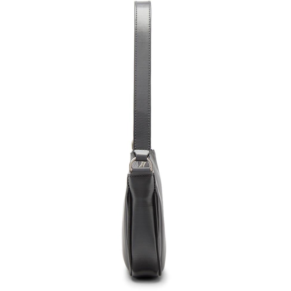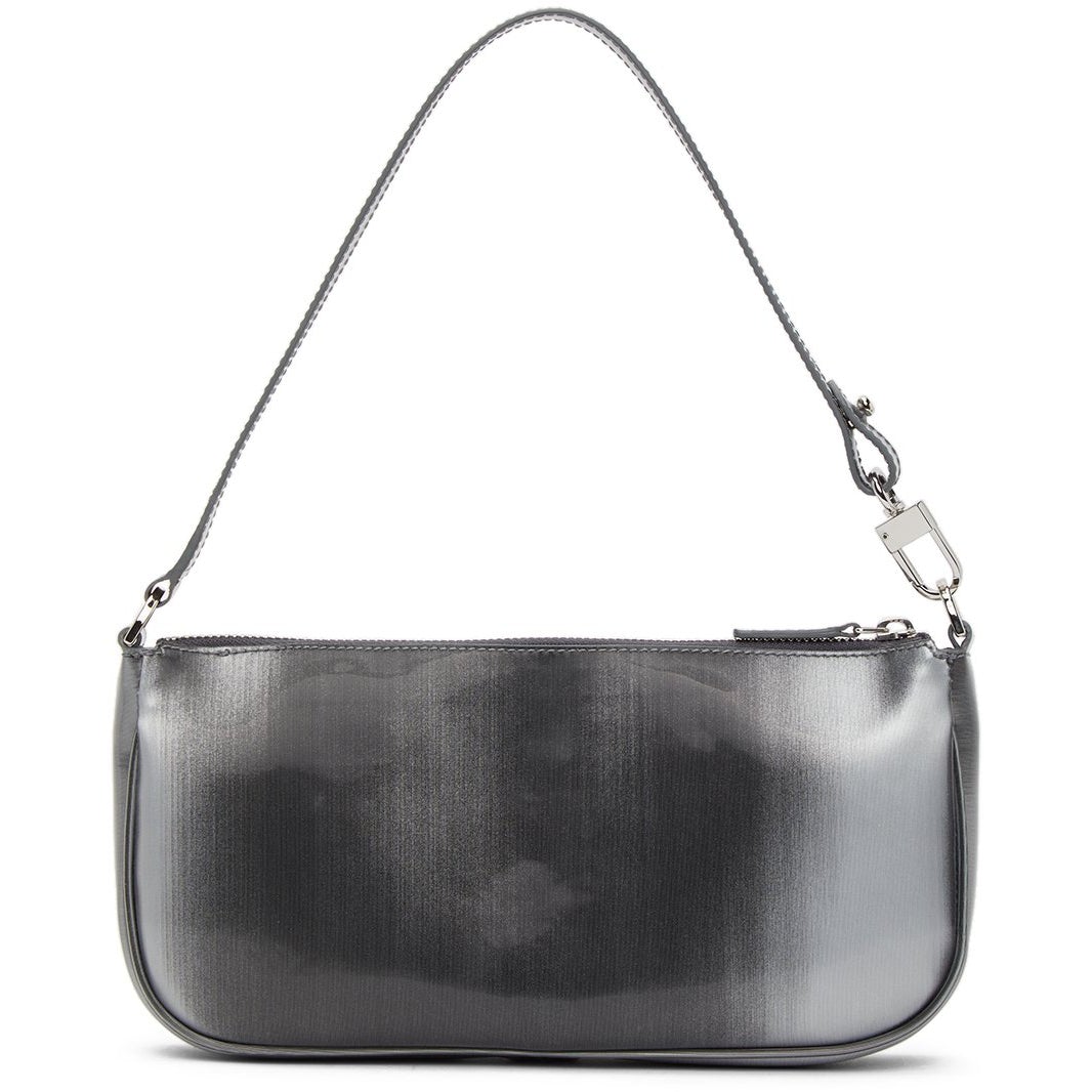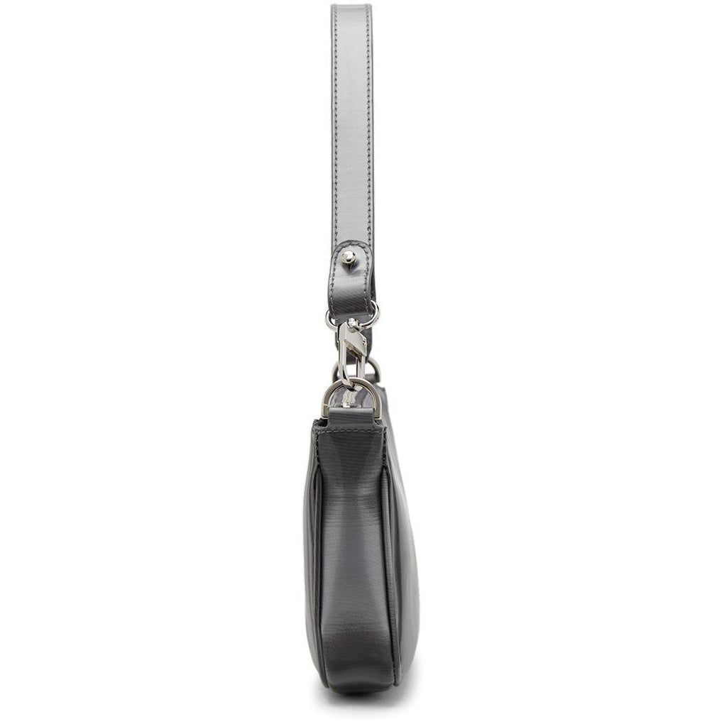 Patent leather shoulder bag in grey. Shoulder strap with lanyard clasp fastening. Zip closure. Leather logo patch at interior. Cotton twill lining in off-white. Silver-tone hardware. Approx. 10 length x 5.25 height x 1.5 width. Supplier color: Graphite Leather. Brand: BY FAR