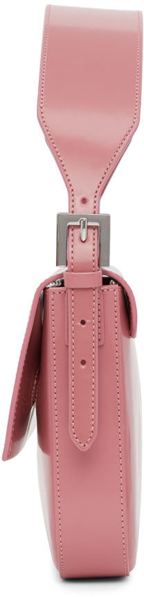 Patent leather shoulder bag in pink. Adjustable shoulder strap with pin-buckle fastening. Foldover flap with magnetic press-stud fastening. Patch pocket and leather logo patch at interior. Cotton twill lining in off-white. Silver-tone hardware. Approx. 11.5 length x 6.5 height x 1.75 width. Supplier color: Pink Leather. Brand: BY FAR