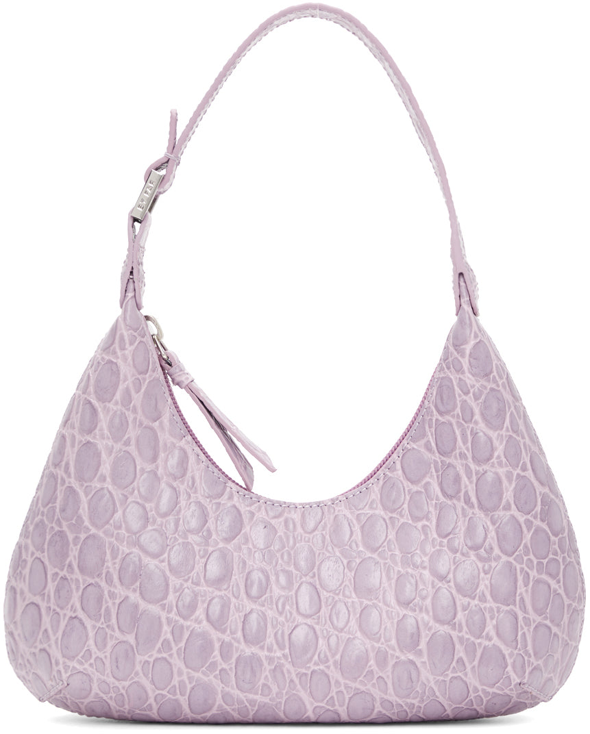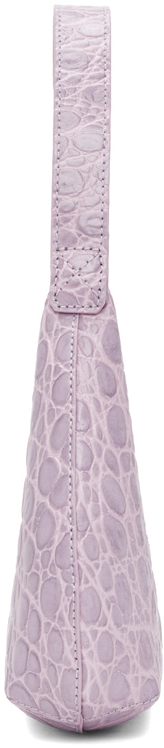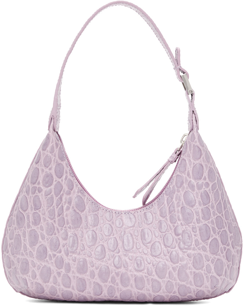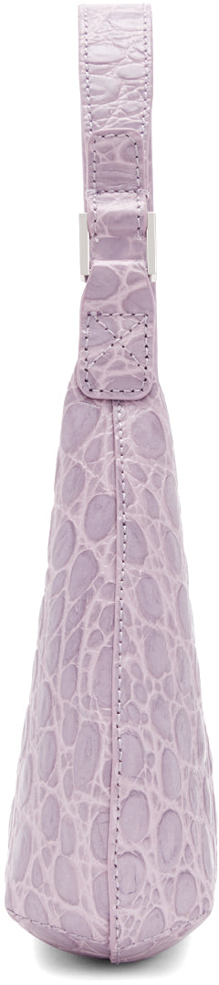 Croc-embossed leather shoulder bag in purple. Fixed strap at top. Zip closure. Patch pockets and embossed leather logo patch at interior. Cotton twill lining in off-white. Silver-tone hardware. Approx. 7.5 length x 6.5 height x 2 width. Supplier color: Lilac Leather. Brand: BY FAR